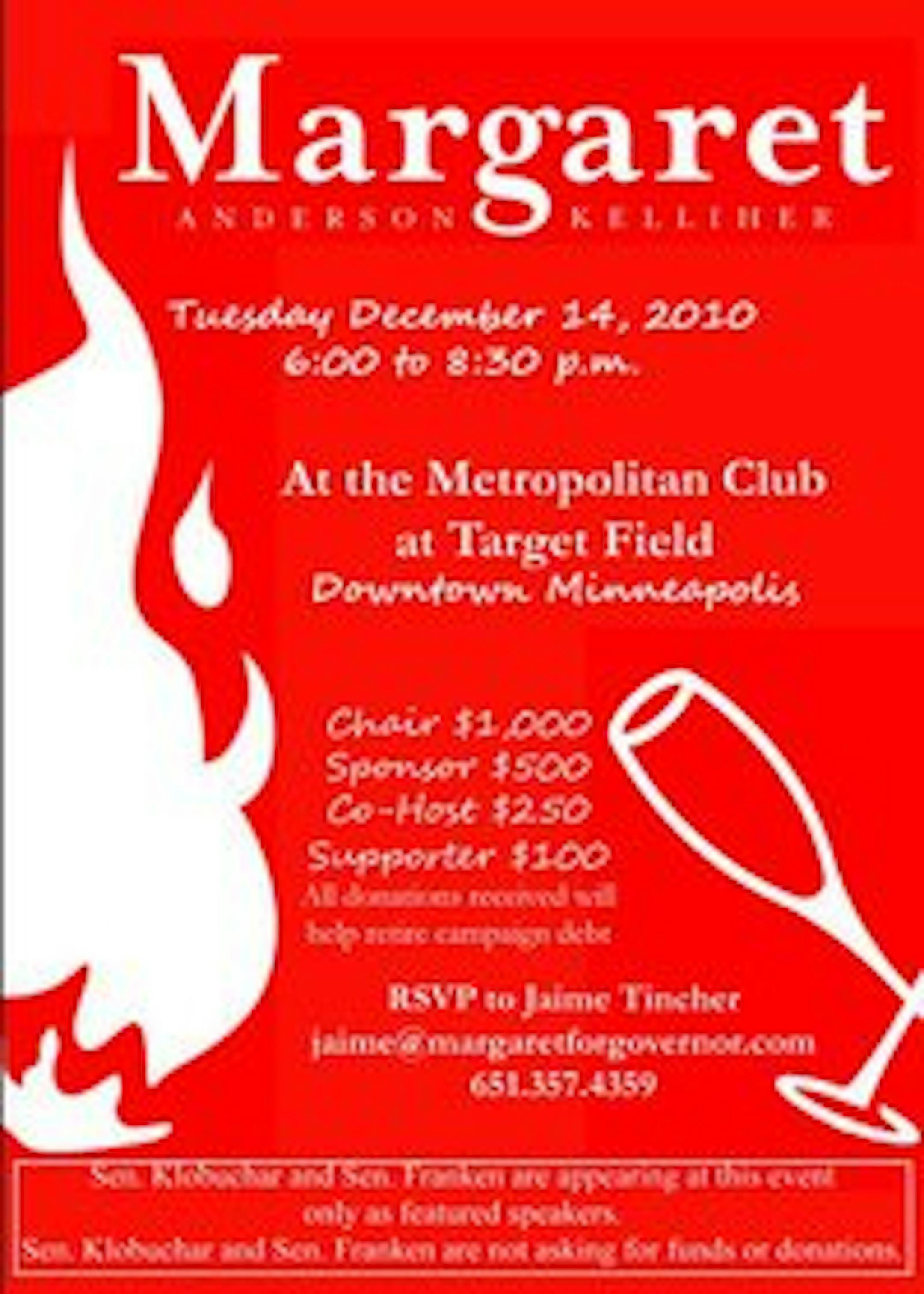 Attendees to event, at the Metropolitan Club at Target Field,include U.S. Sens Amy Klobuchar, Al Franken, Governor-elect Mark Dayton and likely any other DFLer with a reason to see and be seen. Suggested contributions range from $1,000 to $100.