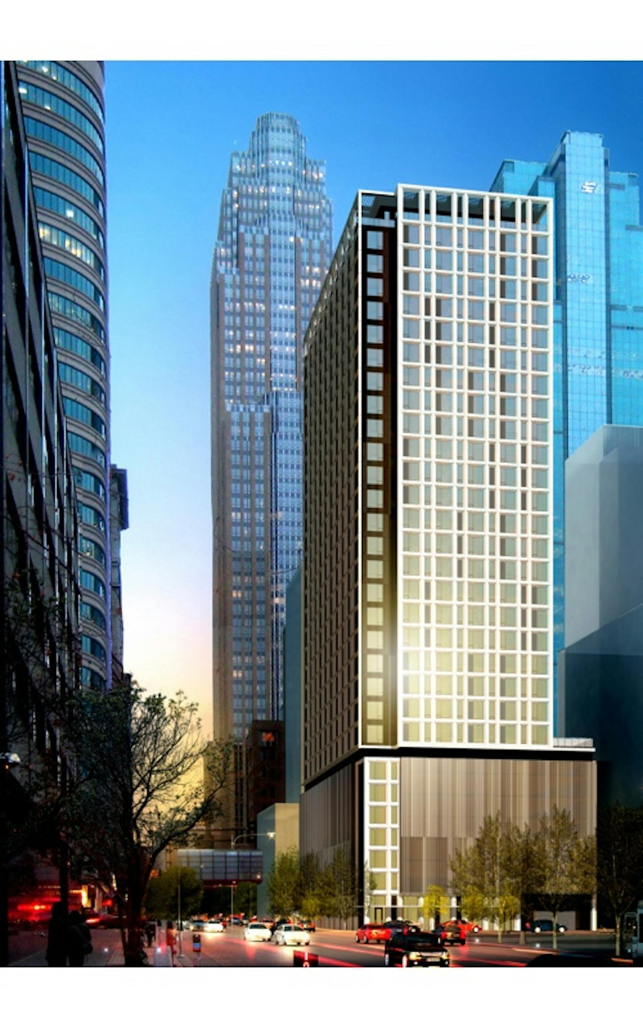 It doesn't have any. Although the article says: "The building will have some unique design features, including an above-grade parking garage that will be wrapped in a shimmering double layer of perforated metal screen."