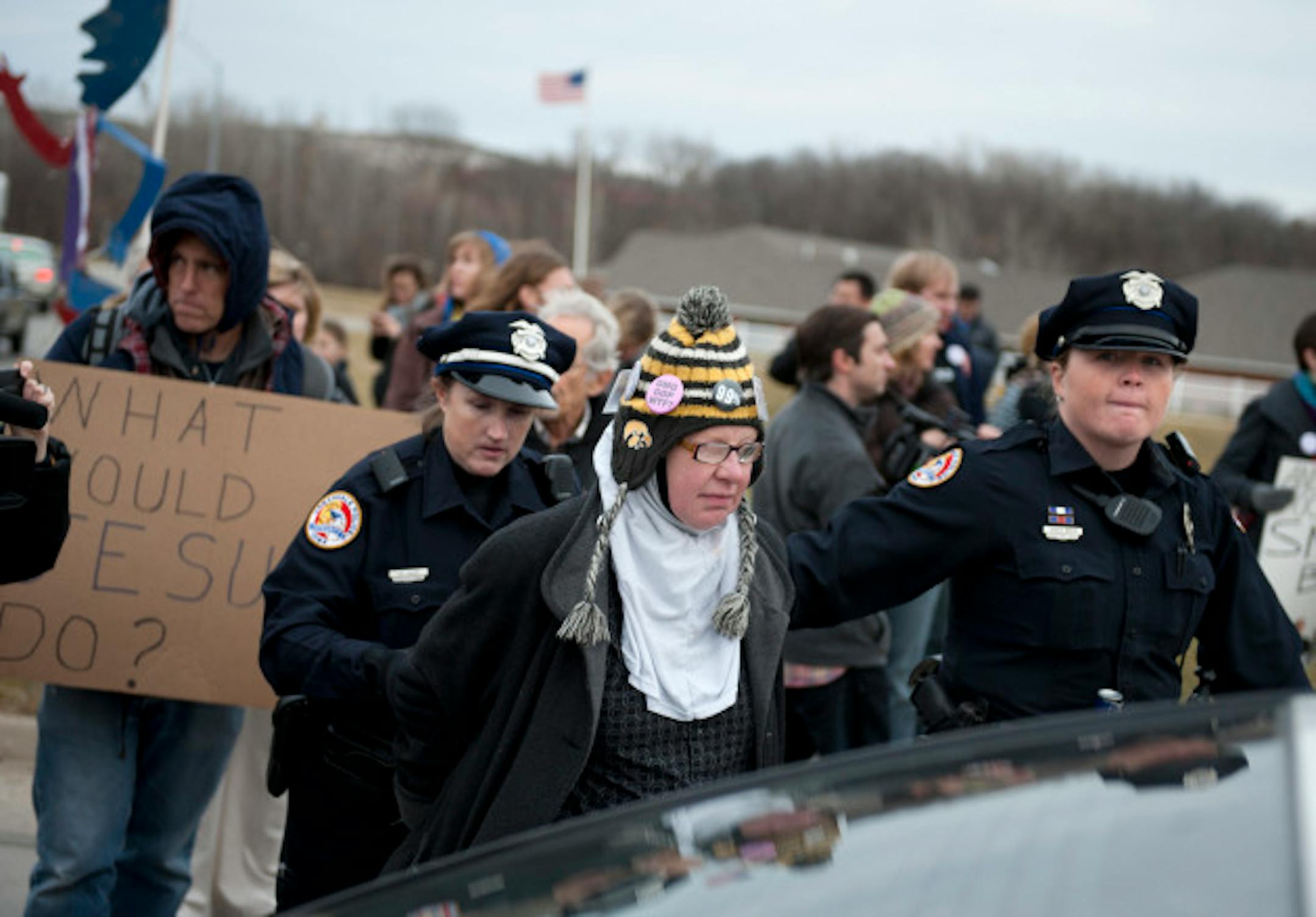Presidential candidate Michele Bachmann and her husband Marcus were ushered through a back door Saturday as several dozen Occupy Des Moines protesters descended on her suburban Urbandale headquarters chanting slogans and banging drums. Urbandale Police said they made 10 arrests after a scuffle broke out between some of the protesters and members of Bachmann's advance security detail. Two of those detained were juveniles, and one was identifiedy by police as Peter Grinsell of Vadnais Heights, Minn. One of the juveniles had been arrested in previous Des Moines area protests, according to fellow protesters. Bachmann, addressing campaign workers after the demonstration broke up, joked that the protesters were "Barack Obama's reelection advance team," a sign of the fear she said Democrats have of her campaign. The demonstrators, arriving in two brightly painted school buses, forced security and campaign workers to lock down the office moments before the Minnesota Republican's scheduled appearance to meet with volunteers and telephone supporters ahead of Tuesday's Republican caucuses. The demonstrators chanted, "Michele Bachmann, come on out, see what Occupy is all about!" as they crowded around the front glass doors of her office. At the time, Bachmann had yet to arrive in a private car. When she did, moments later, she was taken around the back of the building, which was clear of protesters. The demonstrators, who were cleared out within a half hour by about 10 uniformed police officers, said they planned to protest peacefully at other presidential campaign offices during the day. "We're occupying the caucuses to get them to talk about the issues," said Chris Gaunt, a protester from Grinnell, Iowa. She faulted the police for making "unnecessary" arrests outside Bachmann's office. Urbandale Police Lt. Kent Knopf said the protesters were arrested for trespassing on what constituted private property in the suburban shopping mall where Bachmann's office is located. About a dozen of the protesters came from Minnesota. One of them identified himself as Charlie Mcawesome, 23, of Minneapolis. "She's a Minnesotan," he said of Bachmann, "and she doesn't represent our values."