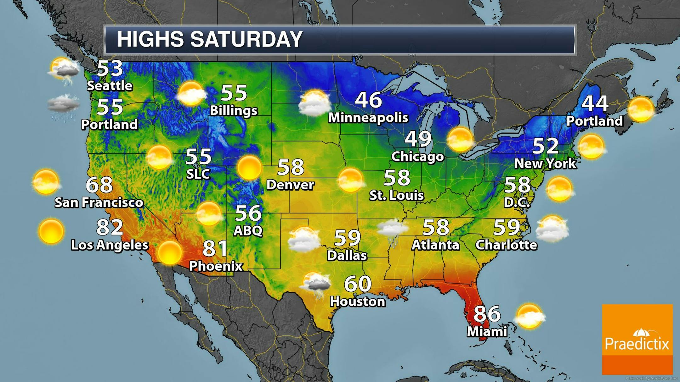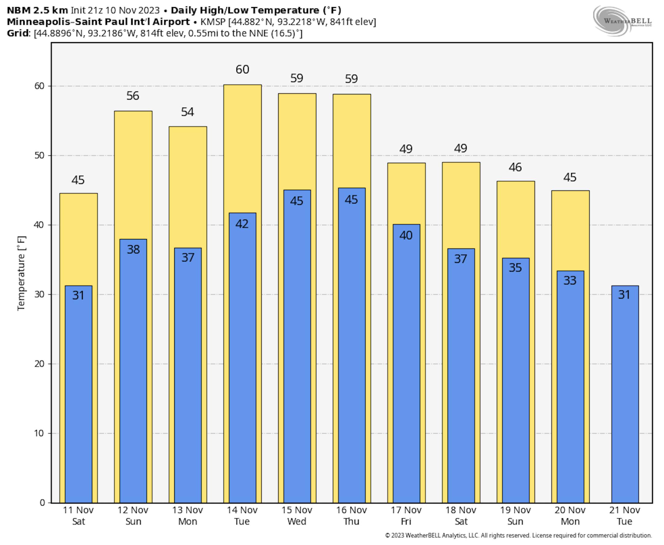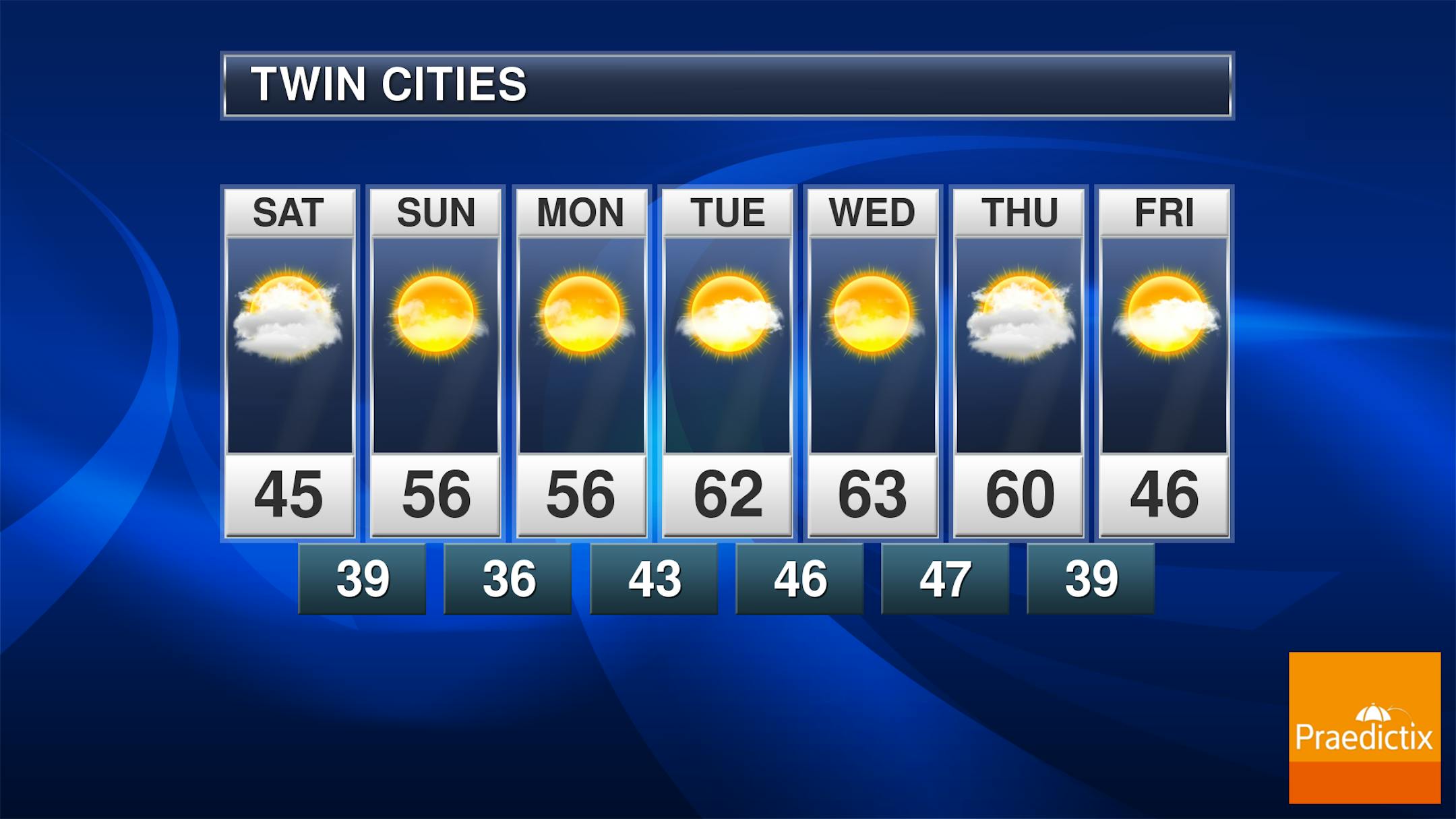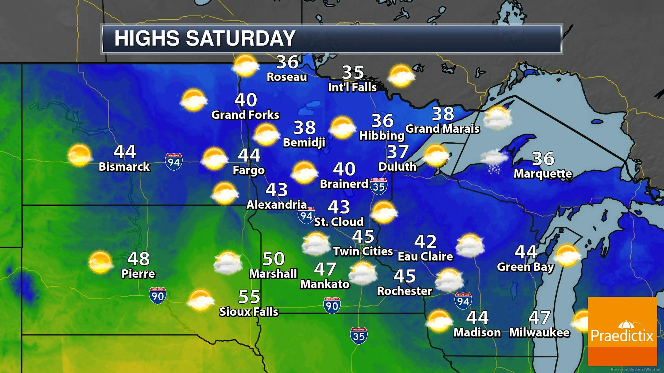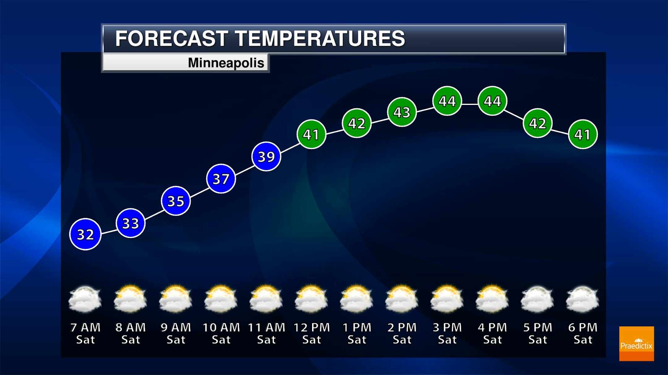 Temperatures in Minneapolis will start in the lower 30s in the morning and will warm into the low/mid 40s by the afternoon. Highs will be pretty close to average for this time of year under mostly cloudy skies.