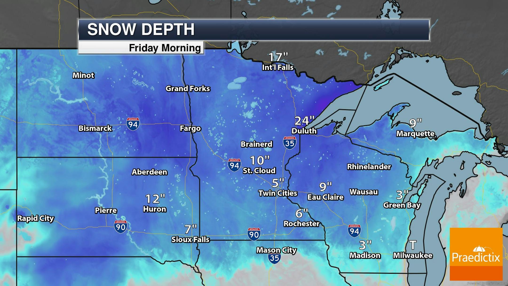 Thanks to our latest storm system, many places are reporting deep snowpack across the region. The heaviest being found across the Dakotas through the northern half of Minnesota into Wisconsin and the UP of Michigan.