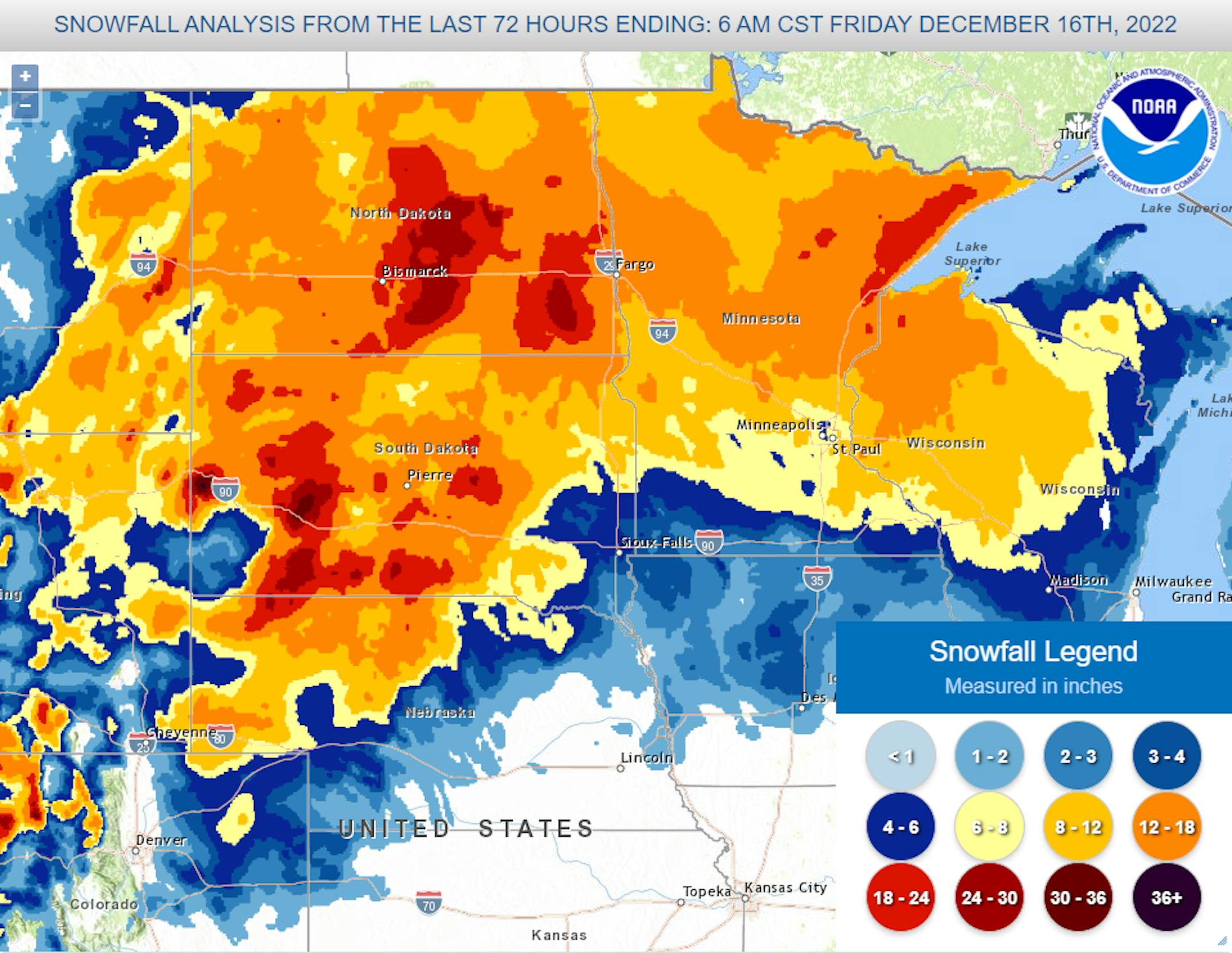 The last several days saw widespread heavy mixed precipitation across the Midwest. Areas of heavy snowfall fell across the High Plains, Dakotas into Minnesota and Wisconsin. 1ft to 2ft of snow fell in some areas (in red), mainly through the Dakotas, but some locations in Northeastern Minnesota and Northwestern Wisconsin saw that as well. The heaviest tally I could find was 48" (4 FEET) in Deadwood and Cheyenne Crossing, South Dakota located in the Black Hills. Now that's a lot of snow! Thanks to gusty winds through the week, widespread blizzard conditions and hazardous travel was reported across much of the Midwest, especially where the heaviest snow fell. Quite a storm!