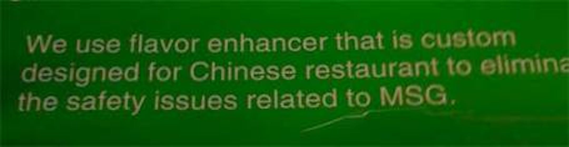 Wouldn't it just be better to say "No MSG," instead of admitting that your food has a flavor enhancer? Granted, the enhancer that is custom designed for Chinese restaurant, but still. At least we know what MSG is; this stuff could be powdered tiger claw, for all we know.