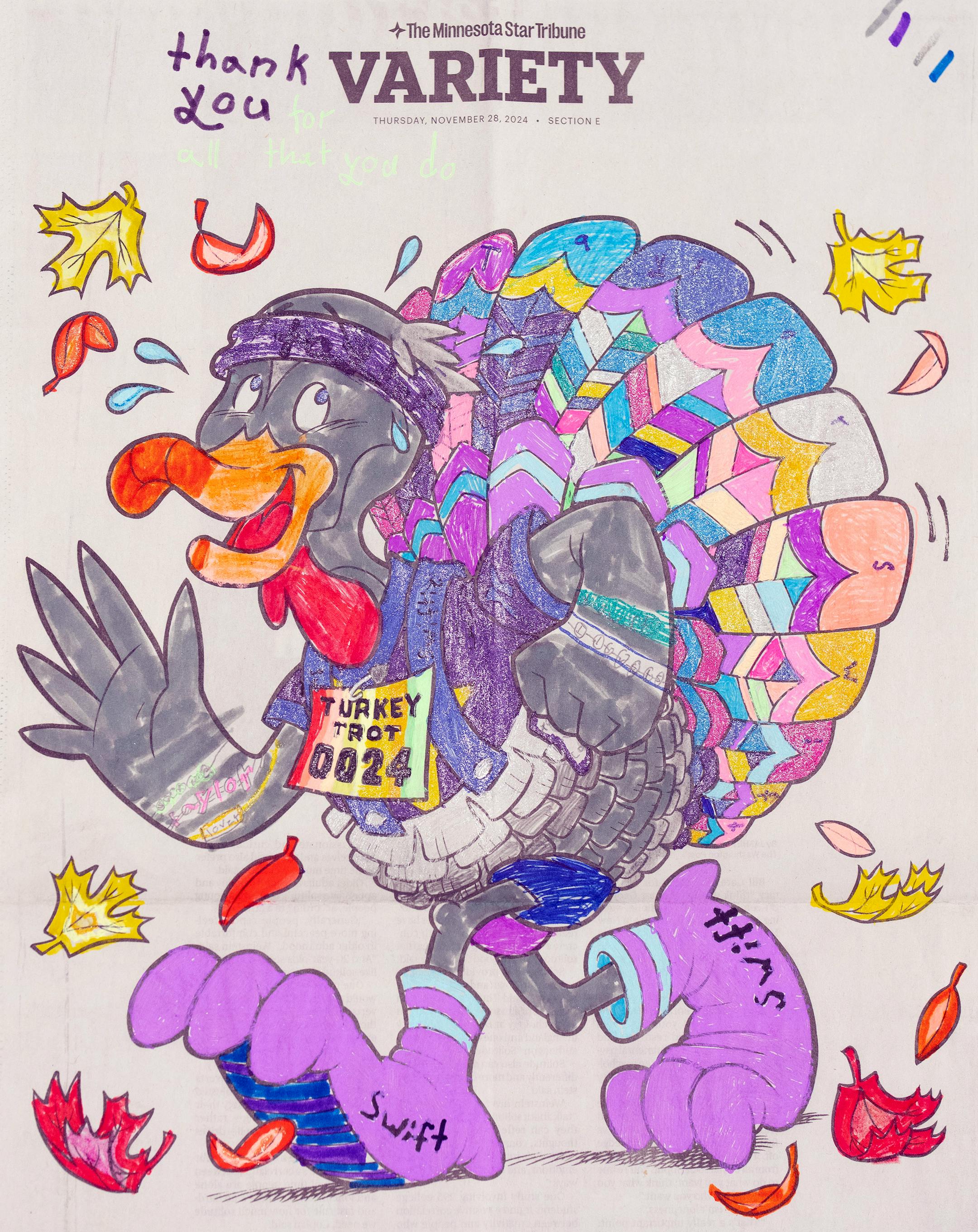 The race for first place is always close. For the 46th Oh, You Turkey! coloring competition, we added an all-ages group, and the race got even tighter. Artists from across the state ranging from age 2 to 92 joined in on the run for Minnesota’s top turkey, er, duck. We saw entries rendered in everything from crayons to watercolors, stipple to scribble, and wallpaper to decoupage. Choosing winners wasn’t easy, but these 12 birds rose above the rafter to bring home the win.