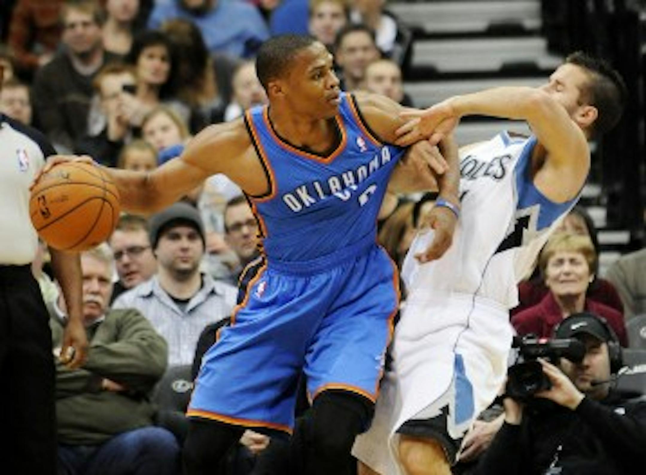 That's what J.A. Adande, a strong basketball writer who does make some good points along the way, is calling for in this piece. Adande suggests the Thunder should trade Westbrook to the Warriors for Stephen Curry. Sorry, but no way. We love Curry as much as the next guy (hindsight-fueled rage about how he could be with the Timberwolves goes here), but he is not the second piece on a potential NBA title contender. Even with as good as Durant is, he needs someone of Westbrook's caliber as his sidekick if the Thunder is going to emerge from the West. Durant probably knows this, which is why he does his best to throw water on Westbrook's fuse when it runs too hot.