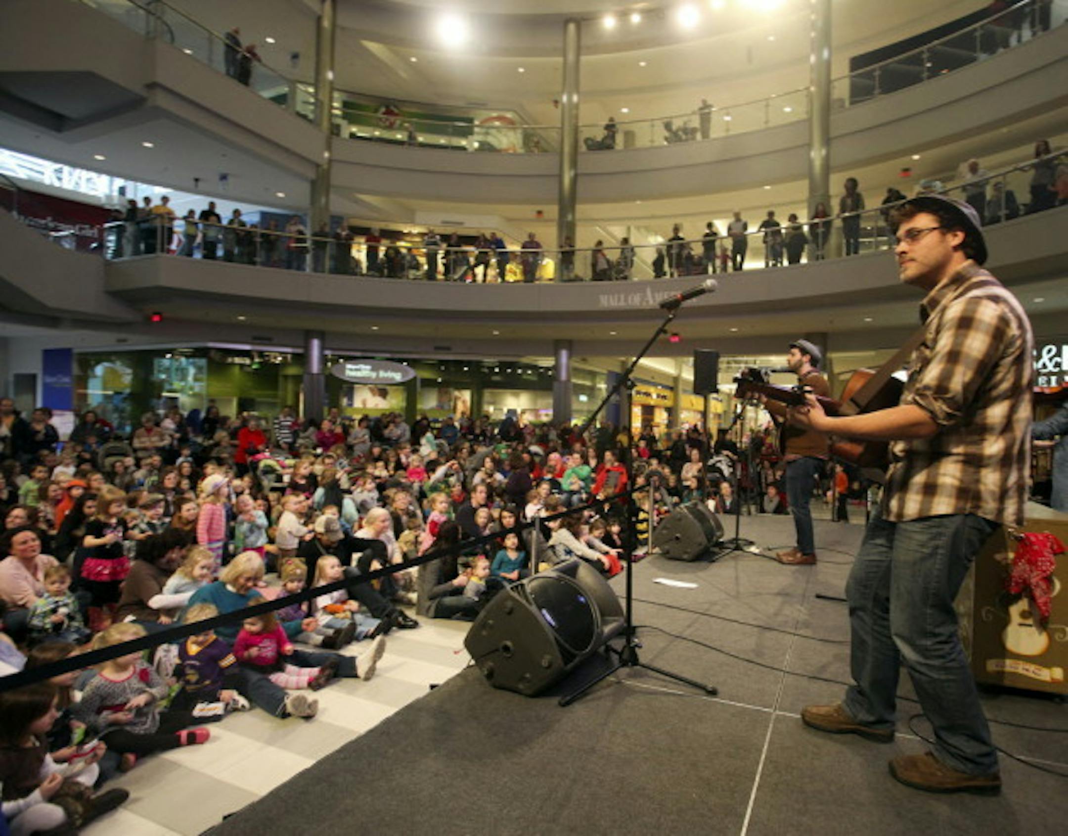 Joe Mailander, front, and Justin Lansing of the Okee Dokee Brothers performed Tuesday at the Mall of America. (Photos by David Joles, Star Tribune).