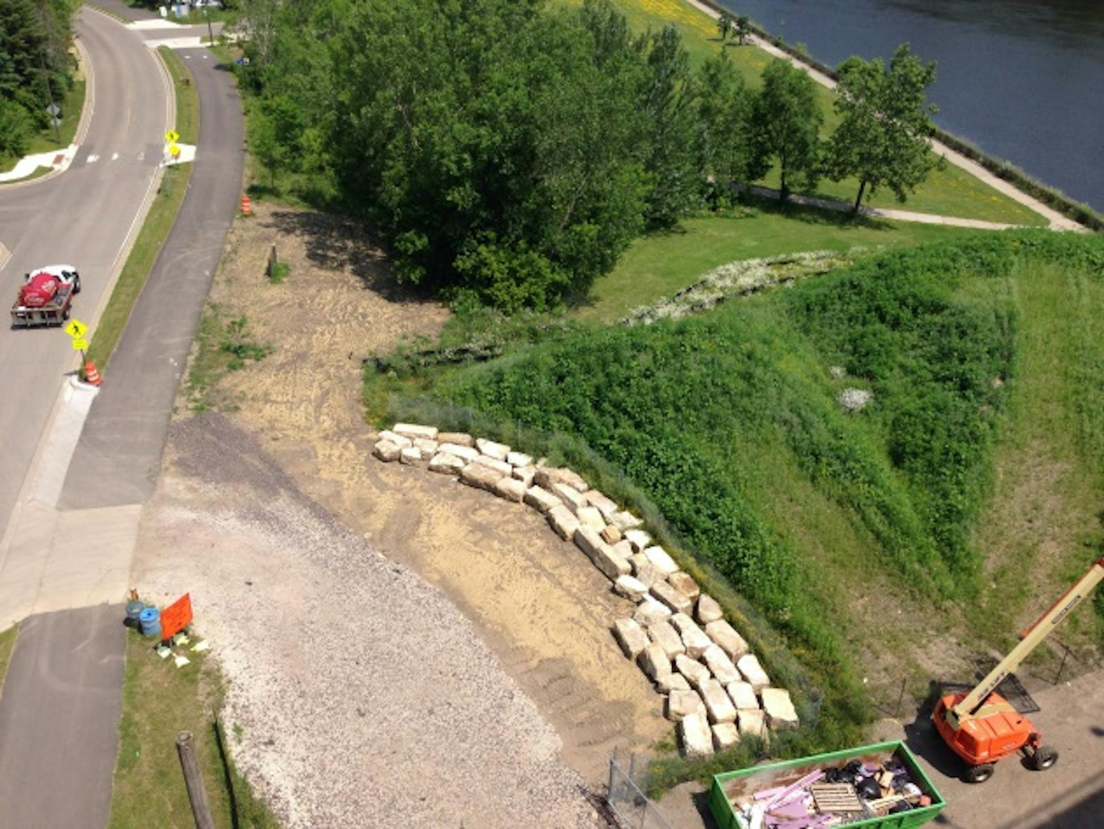 Park Commissioner Scott Vreeland's pet rocks are now in place in a portion of Bohemian Flats below the Washington Avenue Bridge that's being used as a construction staging area.