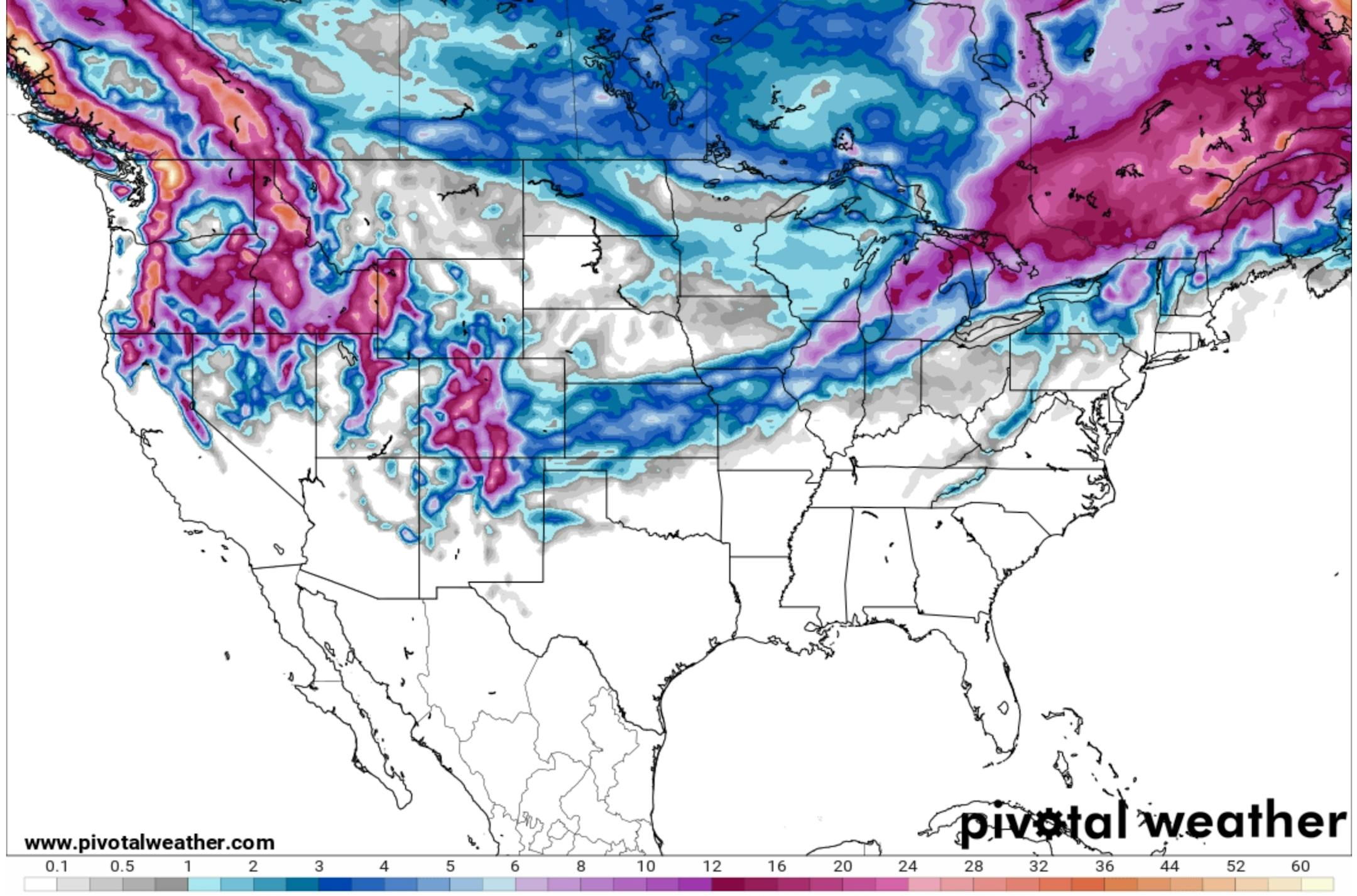 Dribs and Drabs of Snow. NOAA's 18z Tuesday GFS run prints out a stripe of snow well south and east of Minnesota Friday and Saturday, with significant snowfall amounts from the Pacific Northwest into the Colorado Rockies. But a white Christmas for most of Minnesota may come right down to the wire.
