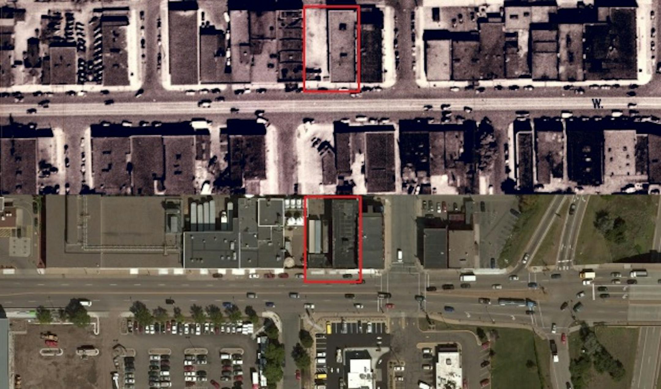Above: A 1938 and 2015 aerial view of West Broadway Avenue. Most of the buildings surrounding 404-410 West Broadway have been demolished. Click here for larger image.