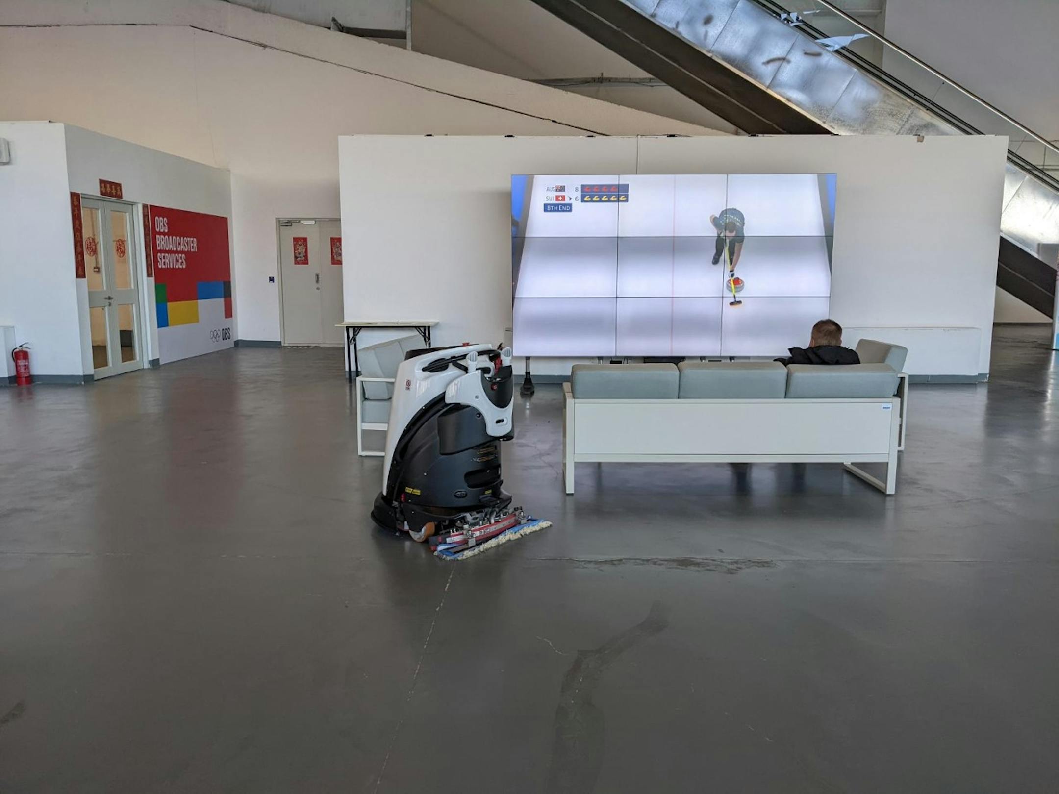 In the Main Media Centre, a cousin of the Roomba scoots along the concrete floors with a dustmop. (That one feels like it's following you sometimes.)