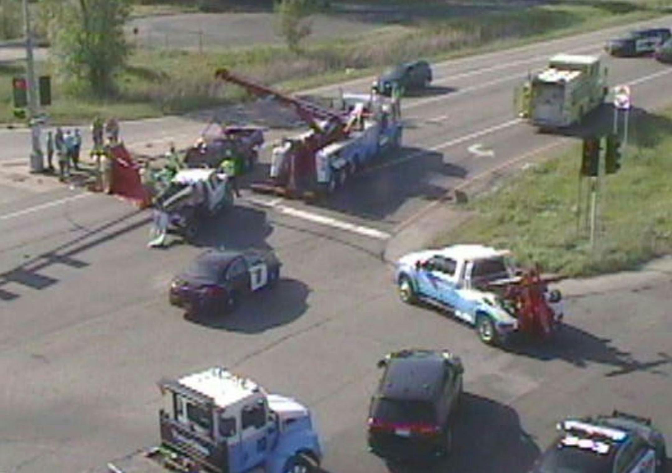 Two southbound pickups collided at the intersection of NE. Hwy. 65 and NE. Crosstown Boulevard just after 3 p.m., according to the Anoka County Sheriff's Office.
