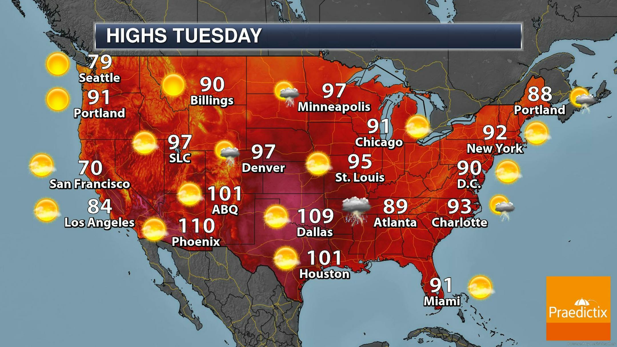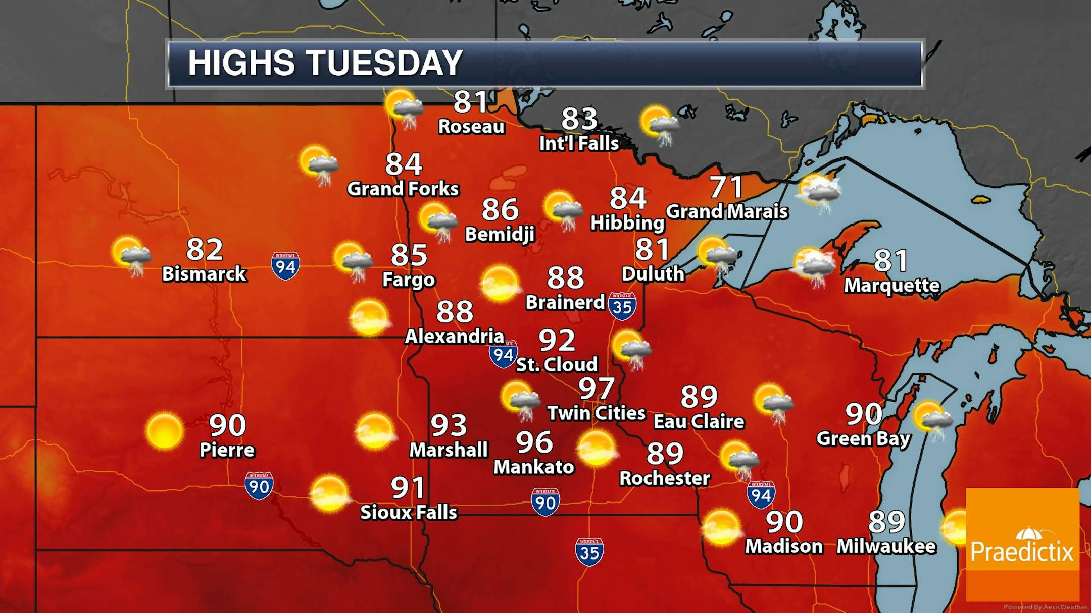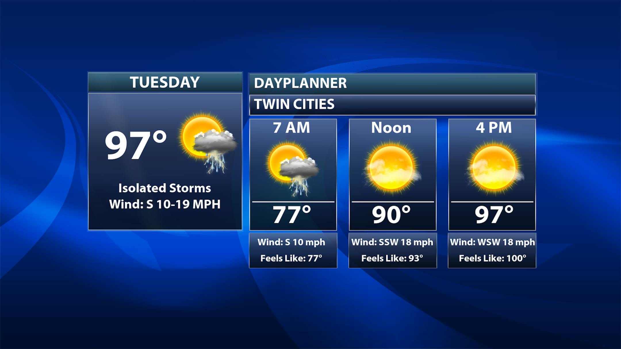 The weather outlook for Minneapolis on Tuesday shows temps warming into the upper 90s. There might be a few isolated storms during the first part of the day, but the rest of the day should be mostly dry.