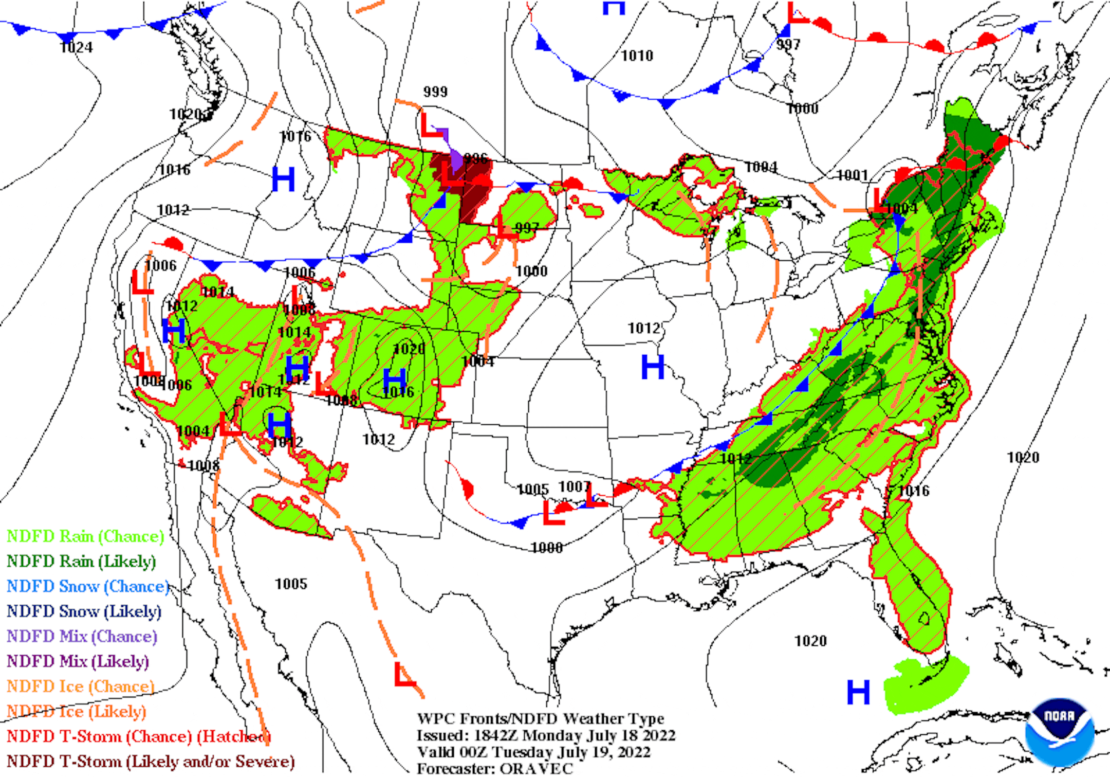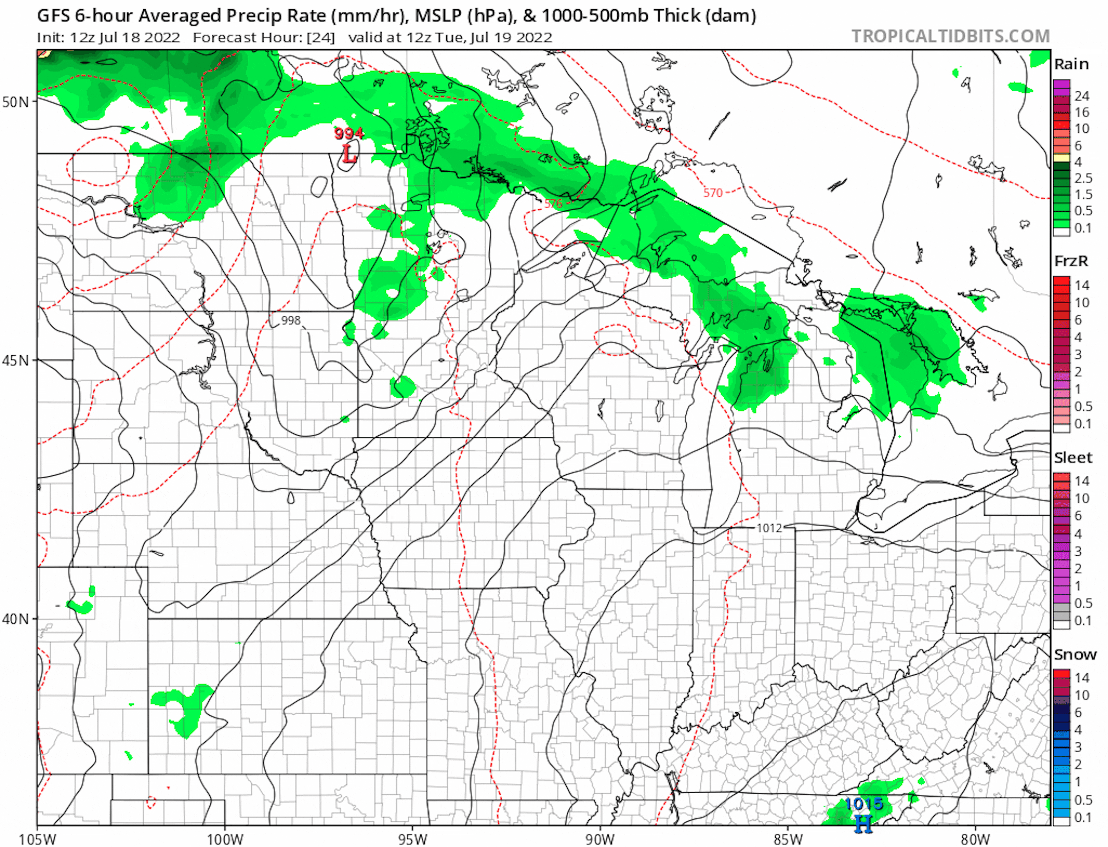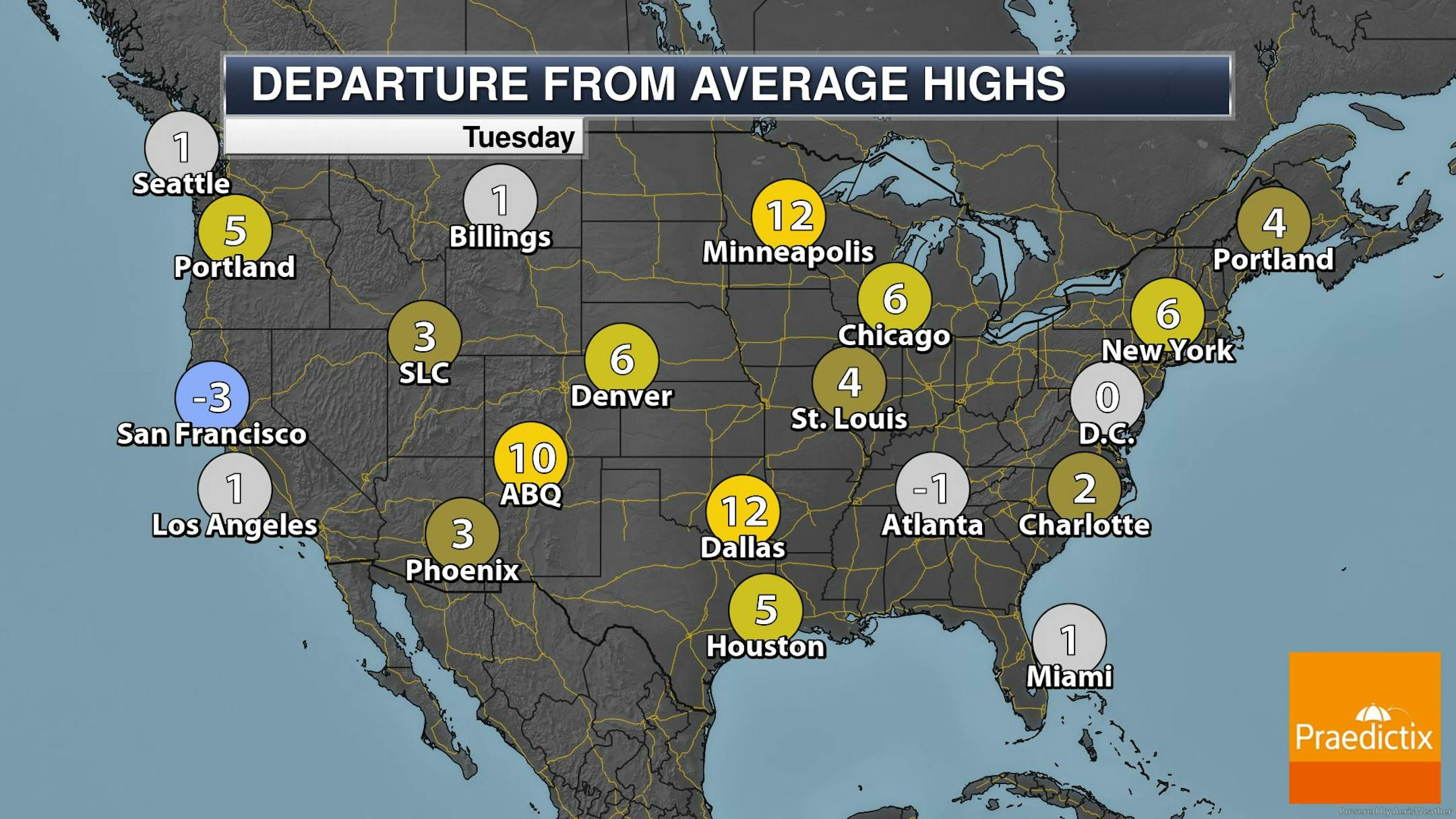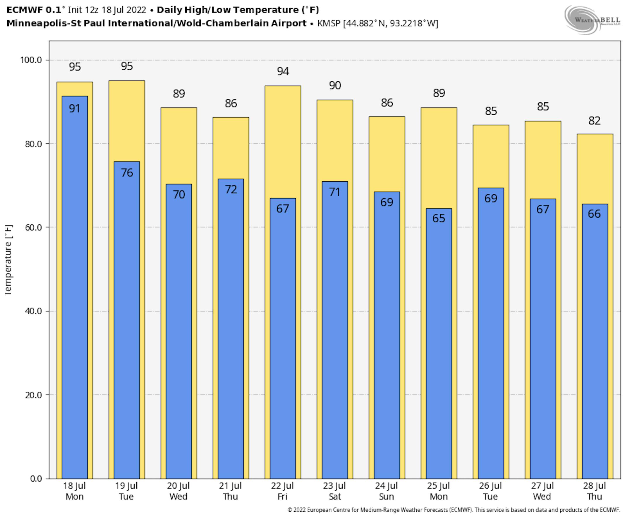 The weather outlook for Tuesday shows temps running well above average for Mid July with readings warming into the 80s and 90s statewide. It'll be a little cooler in the Arrowhead as a cooler, but much of the state will be nearly +5F to +10F above average.