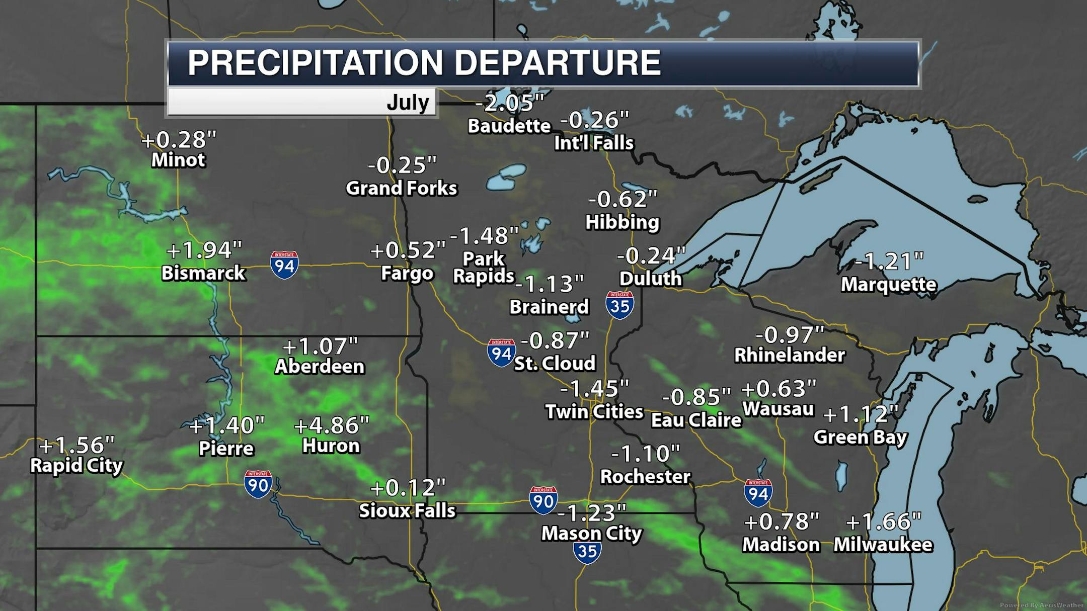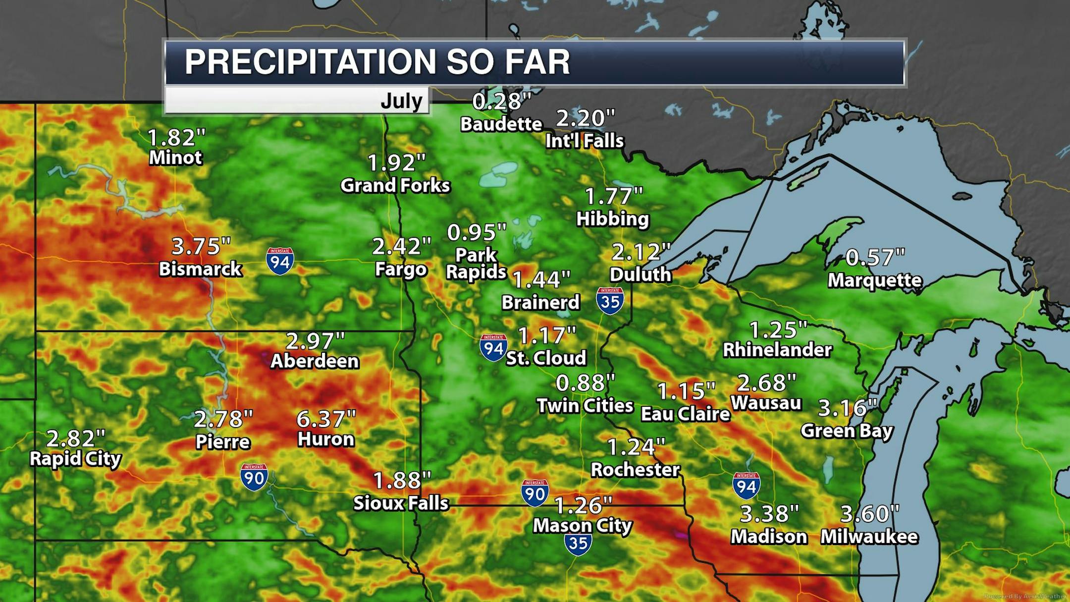 Here's how much rain has fallen across the region so far this July. Note that the Twin Cities has seen 0.88", which is tied for the 35th driest starts to any July on record. Duluth has seen more than 2.00" and several locations across southern Minnesota have seen more than 1" to 2" of rain so far this month.