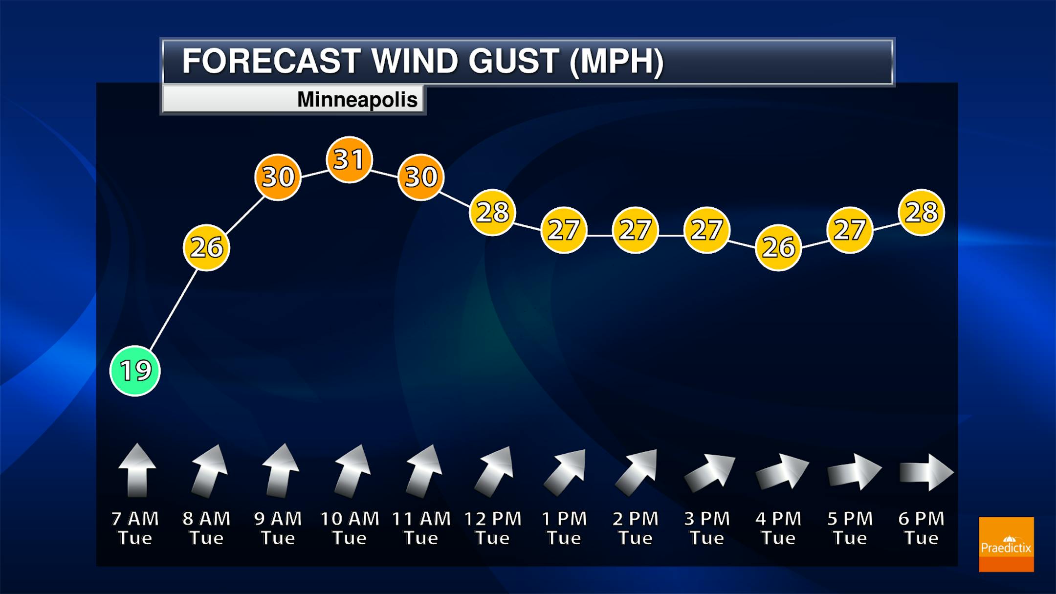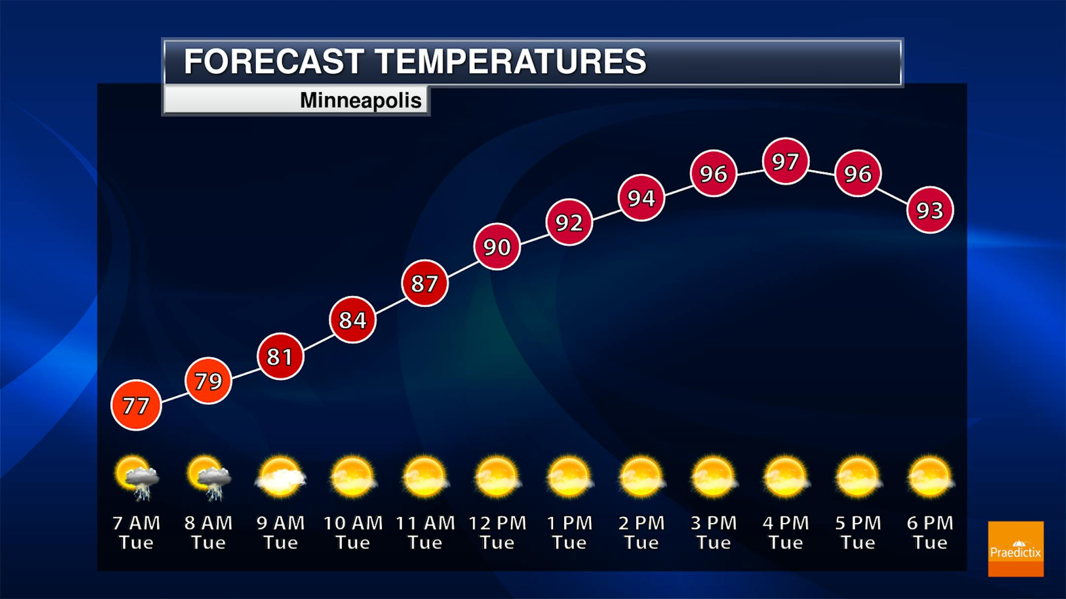 The hourly temps for Minneapolis on Tuesday shows temperatures starting in the upper 70s and warming into the upper 90s by the afternoon. There is a chance of thunderstorms during the early part of the day with a slight chance of showers late in the day. Winds will also be quite strong with SSW gusts approaching 30mph.