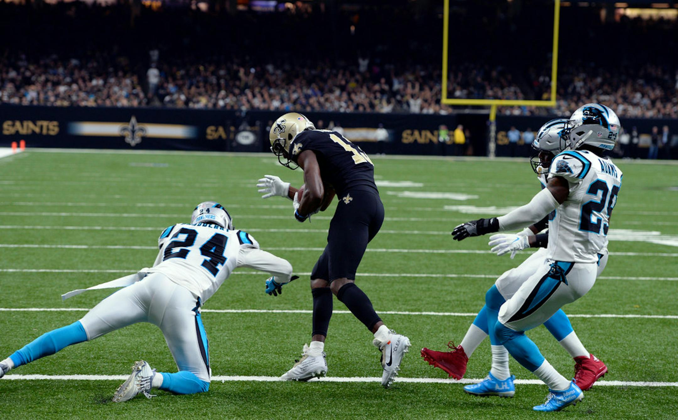 —Carolina's fourth-ranked run defense had little to no answers for Alvin Kamara and Mark Ingram. Kamara had 60 yards and two touchdowns on nine carries (6.7). Ingram broke a 72-yard run. And their combined yards from scrimmage: 248 on 34 touches (7.3).