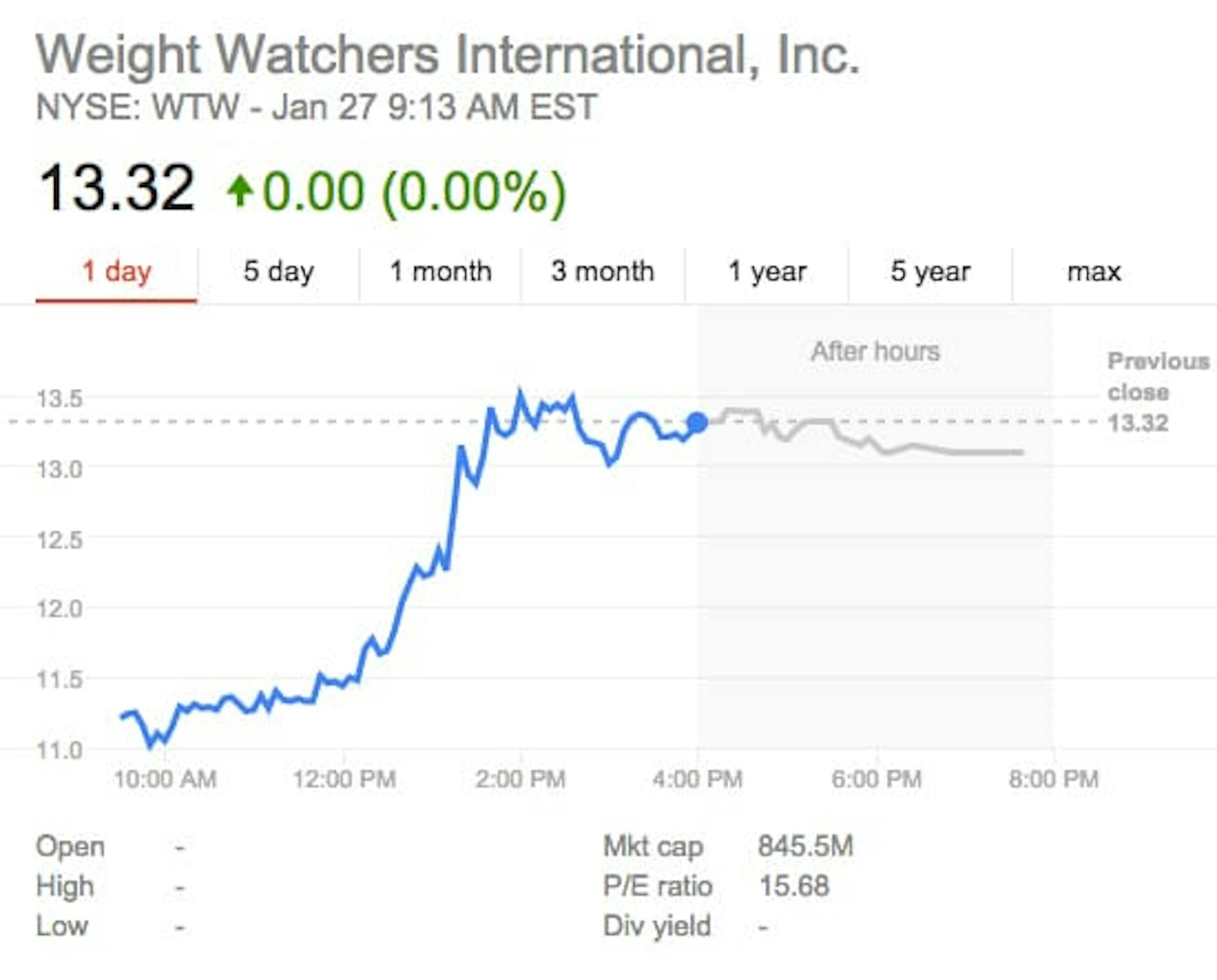 Immediately after her Twitter post, WTW stock soared, settling up 19.51 percent for the day, or plus $2.17 per share.