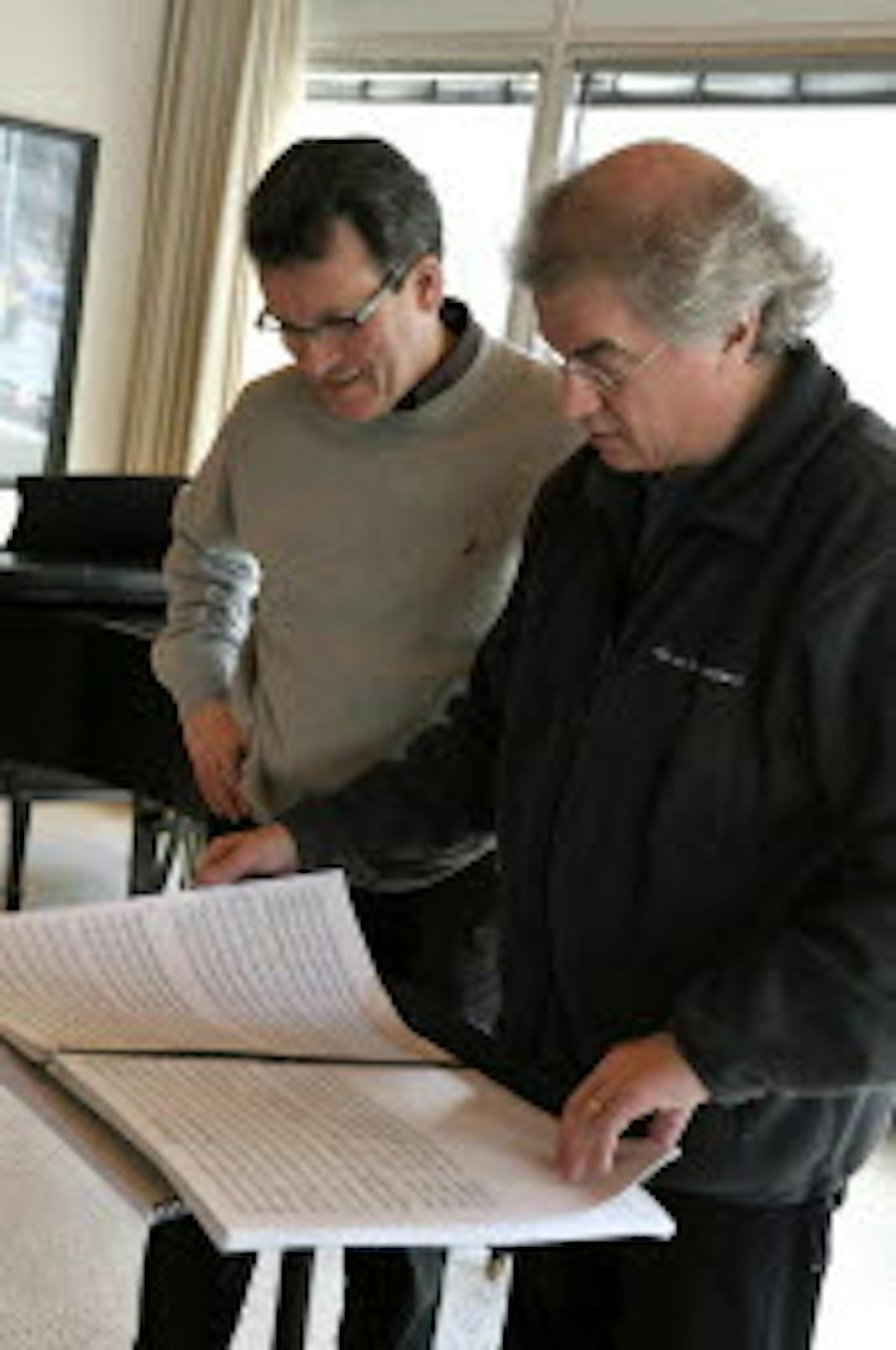 At right, Paulus reviewed the score of "To Be Certain of the Dawn" with music director Osmo Vanska in 2008. Photo by Sharolyn Hagen.