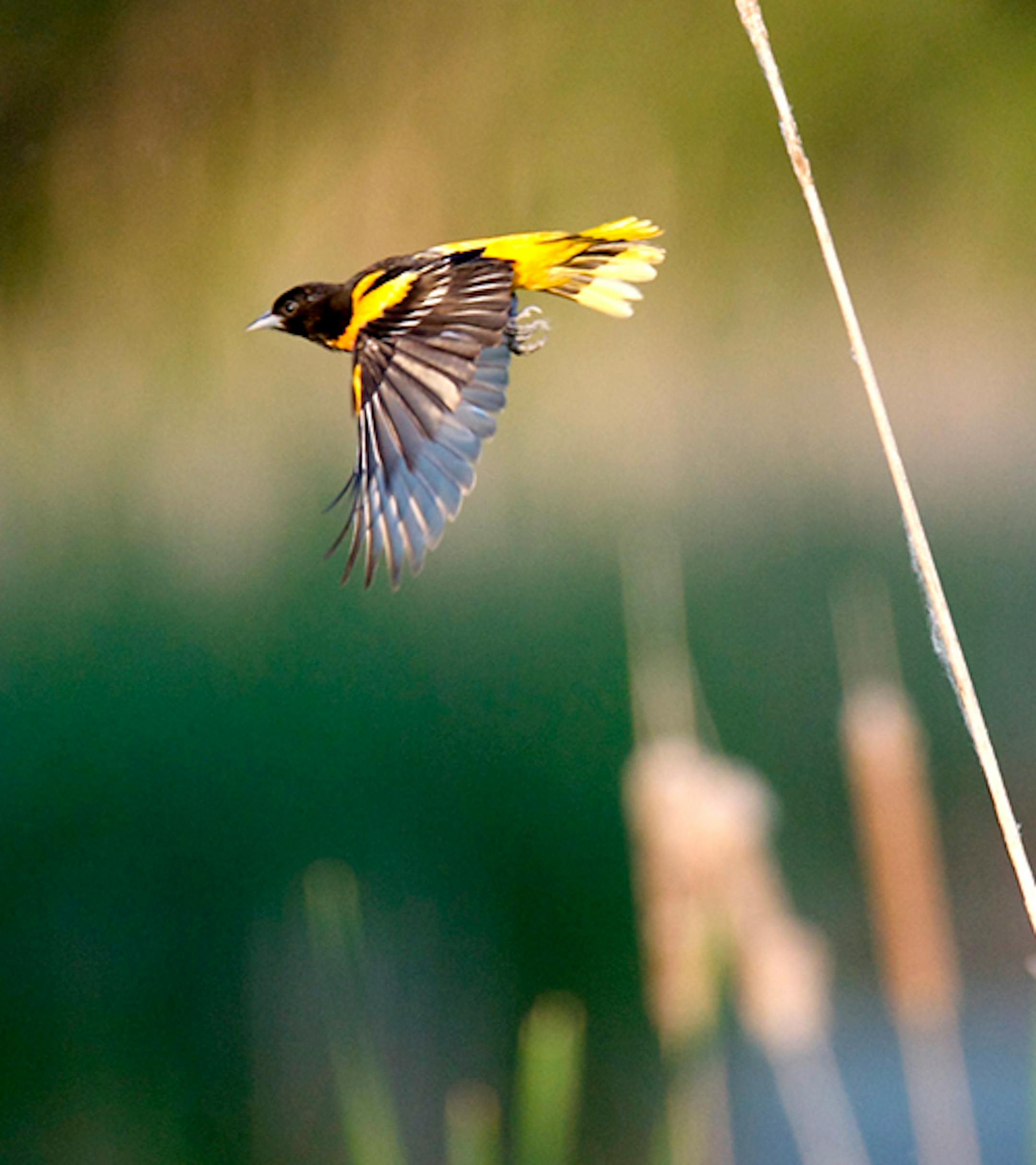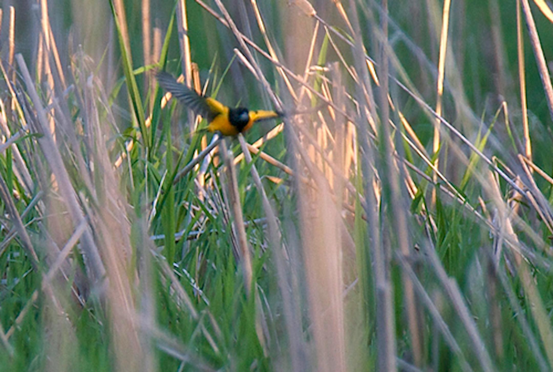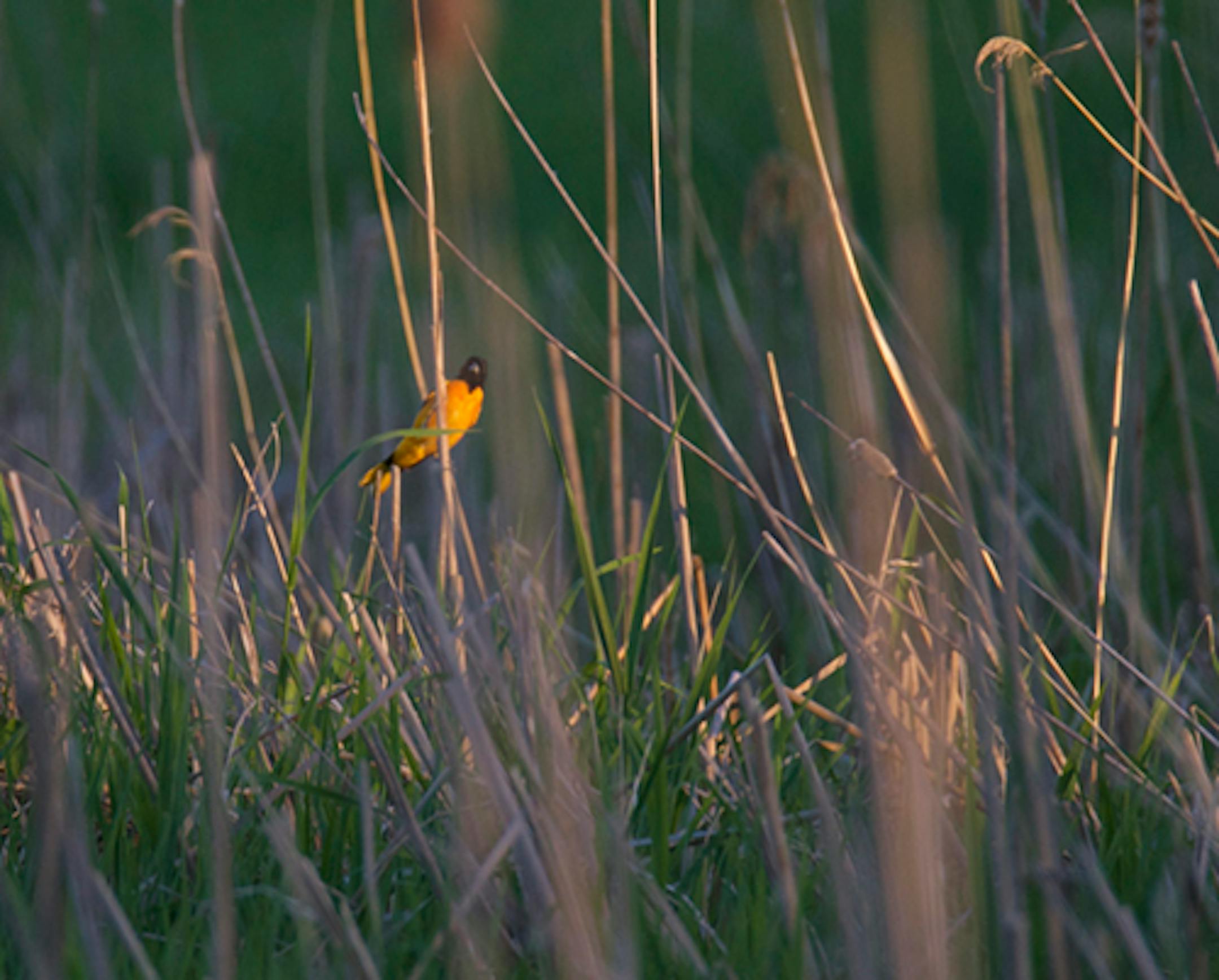 I bird most often in a nearby wooded area holding one large pond and two smaller. There are cattails and marsh grass. This is where I've watched the kingfishers feed. There are Baltimore Orioles here, one pair or two. I want to find an oriole nest, so I watch the birds closely. Monday nigght and again on Tuesday, minutes before sunset, a male oriole swept down from a tree into the cattail-grass mix in front of me. I hoped it would gather nesting material, give me a chance to locate the nest. No. It flitted among the cattails and the grass, always flying low, grabbing a new perch every few seconds. I think it was foraging for insects on the grass stems. It moved in an impatient manner for three or four minutes, then flew into the woods. The light was perfect, a strip of sunlight coming from behind me, much of the marsh and its surrounds in shade, the bird glowing.