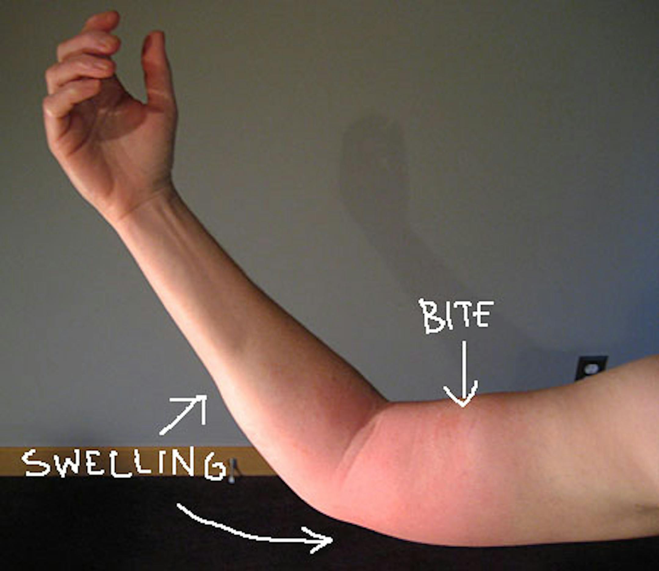 My arm is still red and swollen and itchy. But there are no open sores, no necropsied skin (uh, that I know of), nothing to suggest I am in trouble if I don't rush to the doctor. Then again, what do I know? I'm starting to think this amount of swelling might be a little more than average. But what's average? I don't look like those pics on the Web, anyway.
