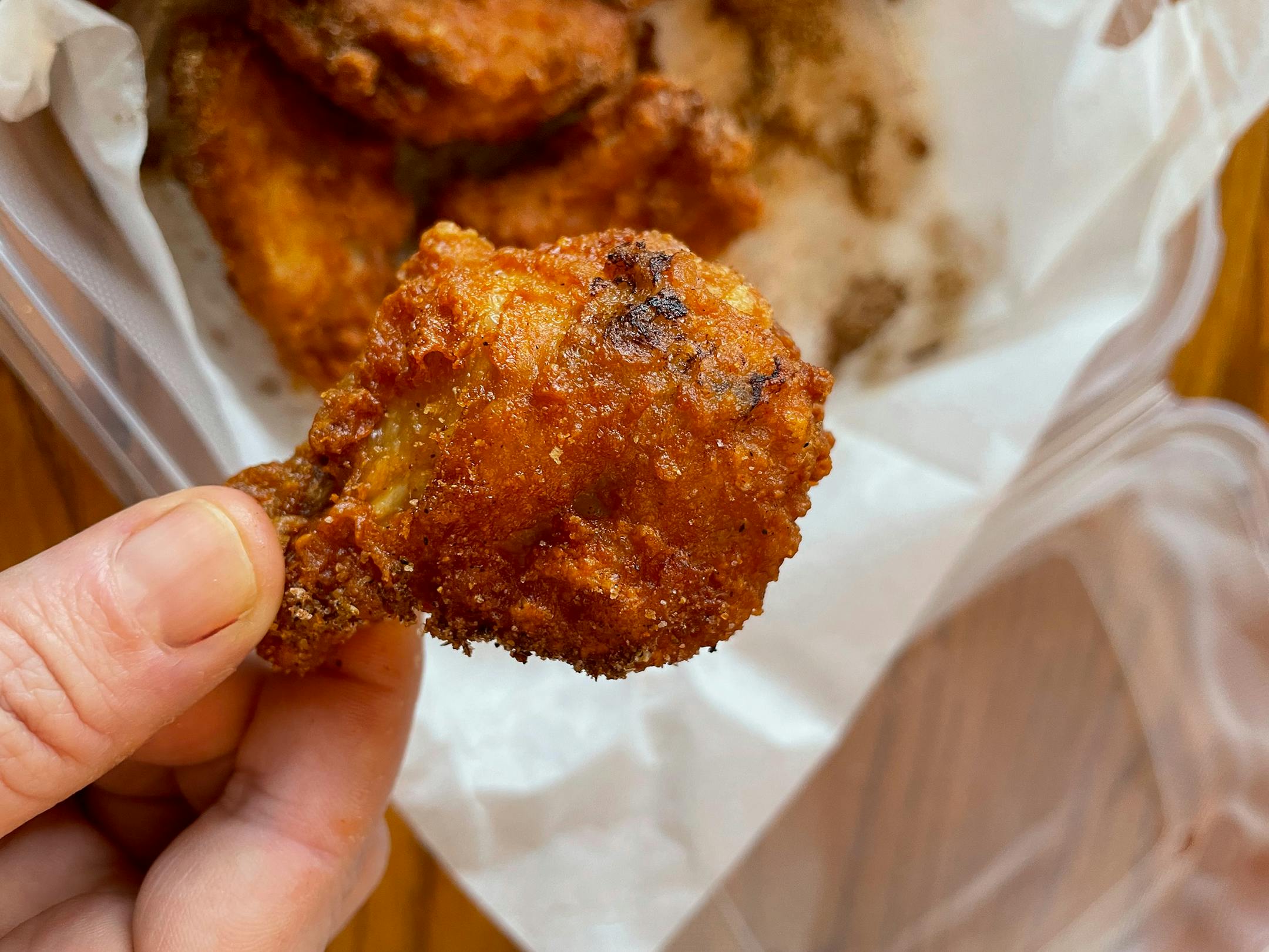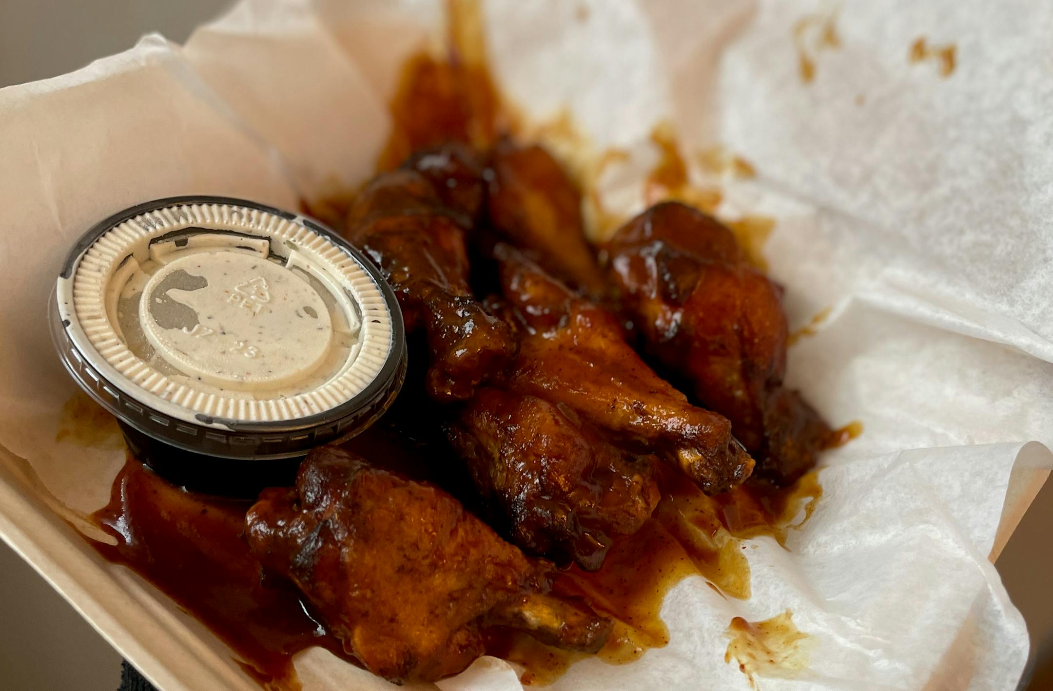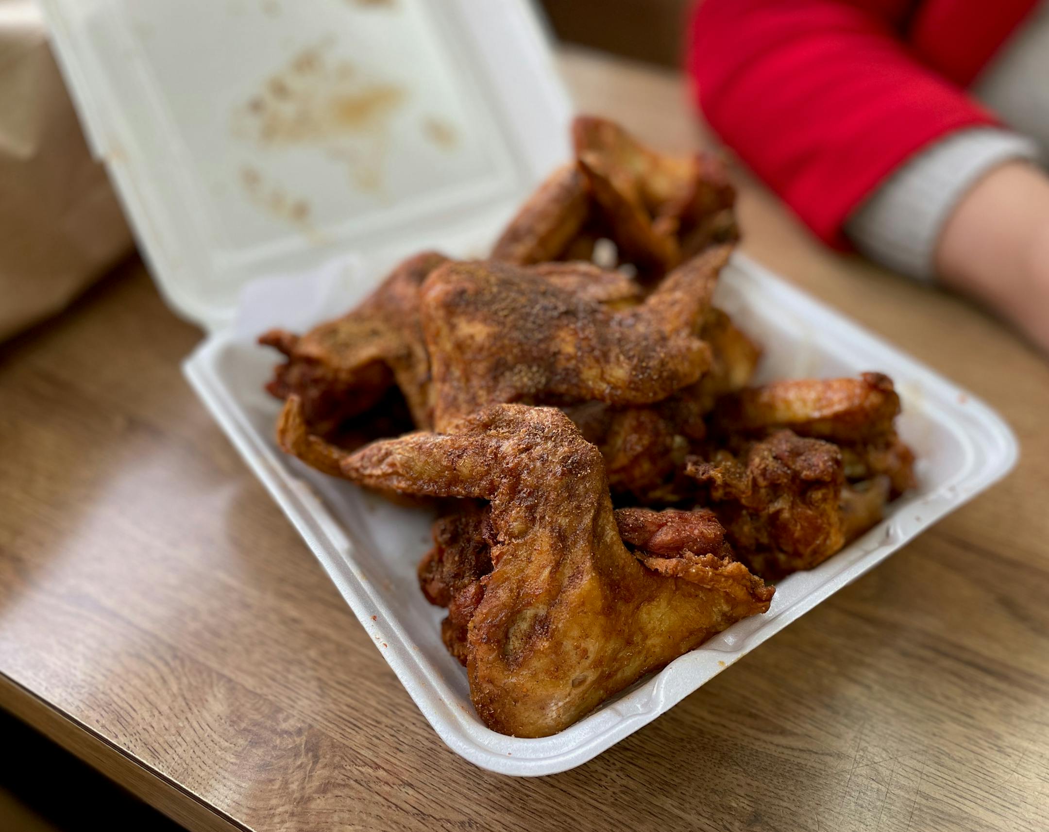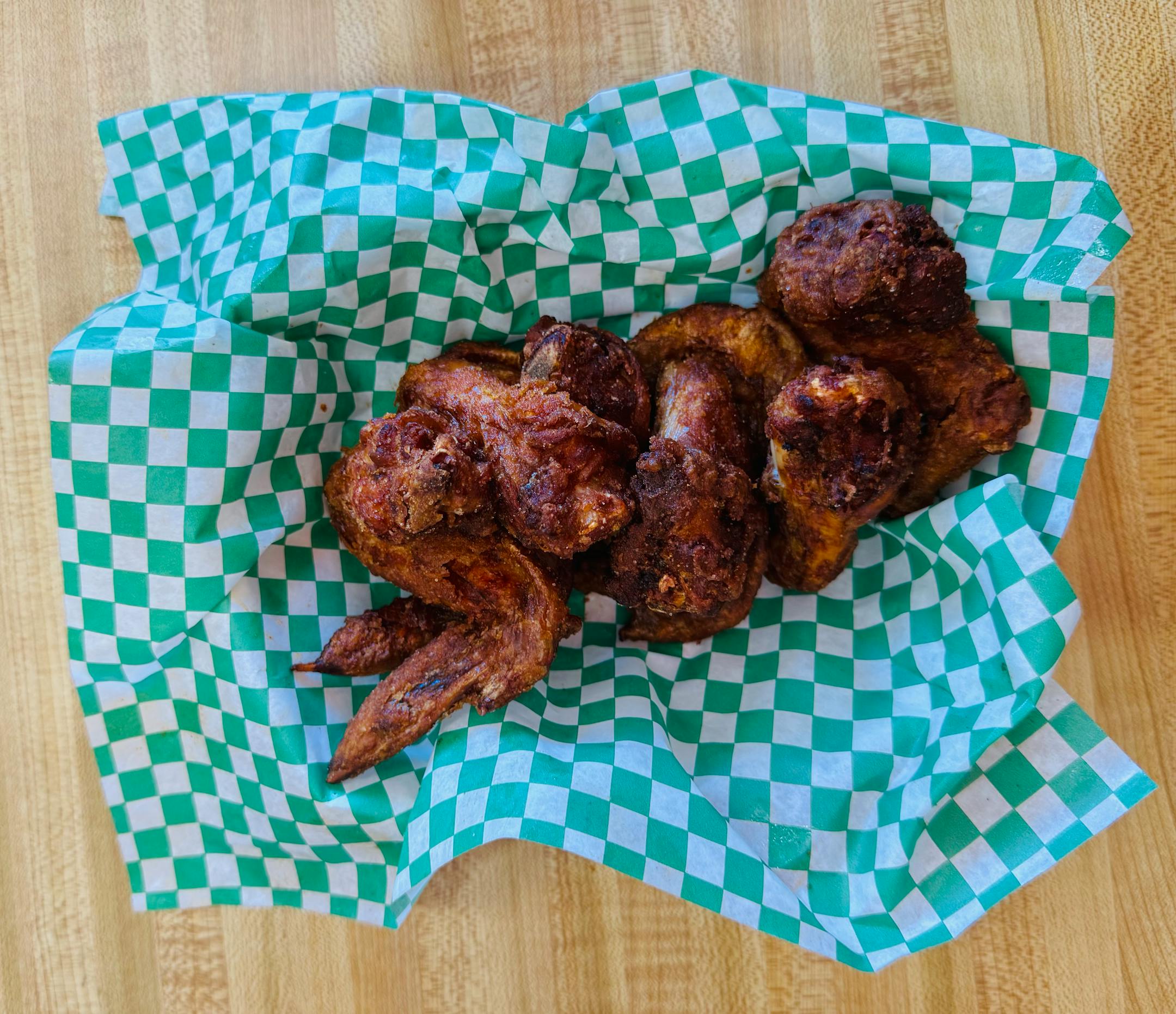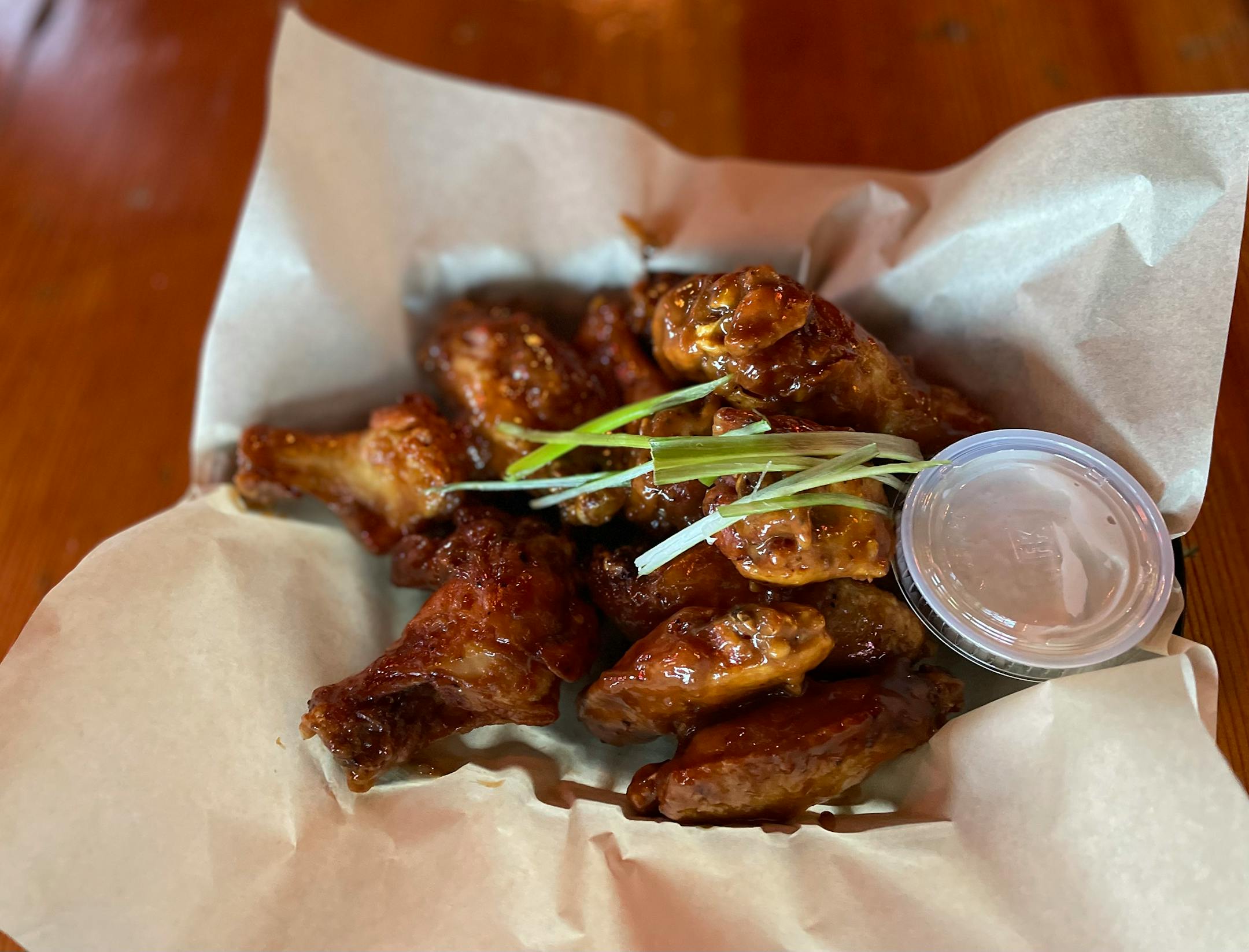 Sending out an alert to spice fans: If you love a burn that’s equal parts flavor and tingly heat, these are the wings you’ve been waiting for. They’re buried in a bed of dried chiles, Sichuan peppercorns, slices of fresh garlic and strands of scallion greens, so digging for these drummies and flats is an interactive game of hunt and eat. The container is brimming with fresh ginger and those dried chiles, which infuse the wings. All that flavor clings to the exterior, giving the mouth a mammoth mix of spice: numbing, burning, tingly, peppery and more.