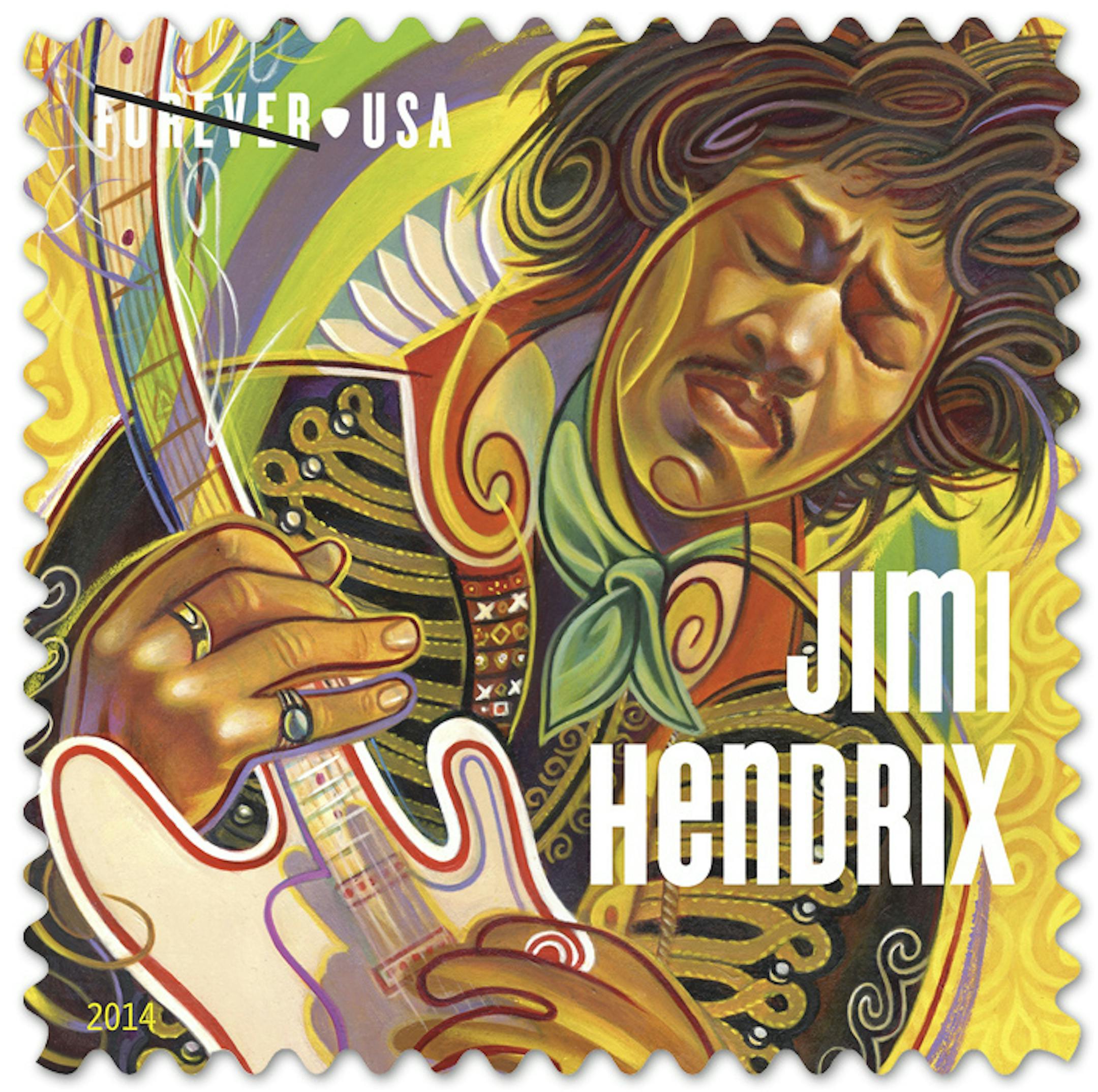 5 We were excited about the Johnny Cash and Ray Charles stamps in the U.S. Postal Service's Music Icon series. Loved the way the sheet of stamps was designed like the sleeve of an old 45 (note to anyone under 40: that's what vinyl singles were like back in the day). Now we're overjoyed with the brand-new Jimi Hendrix stamp. The sleeve is a psychedelic explosion of colors and images — mermaid, butterfly, guitar, spaceship, flowers and a fountain of curls. 'Scuse me while I peel this stamp.