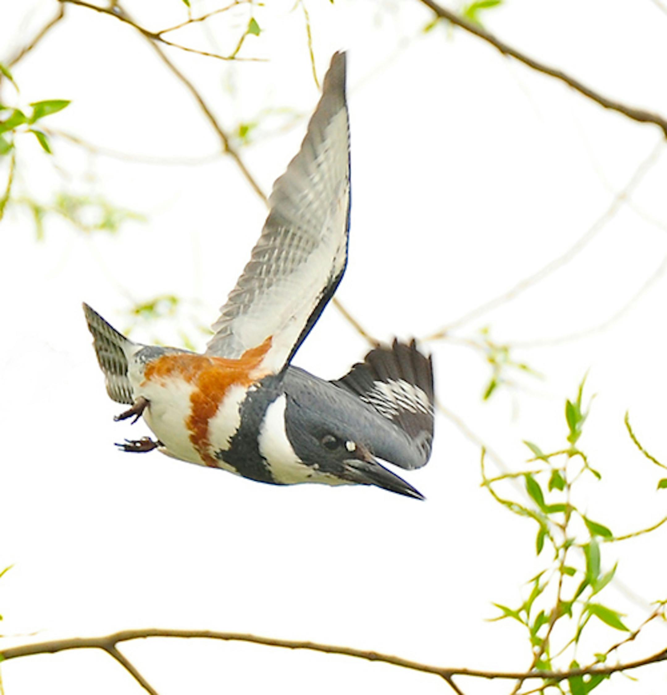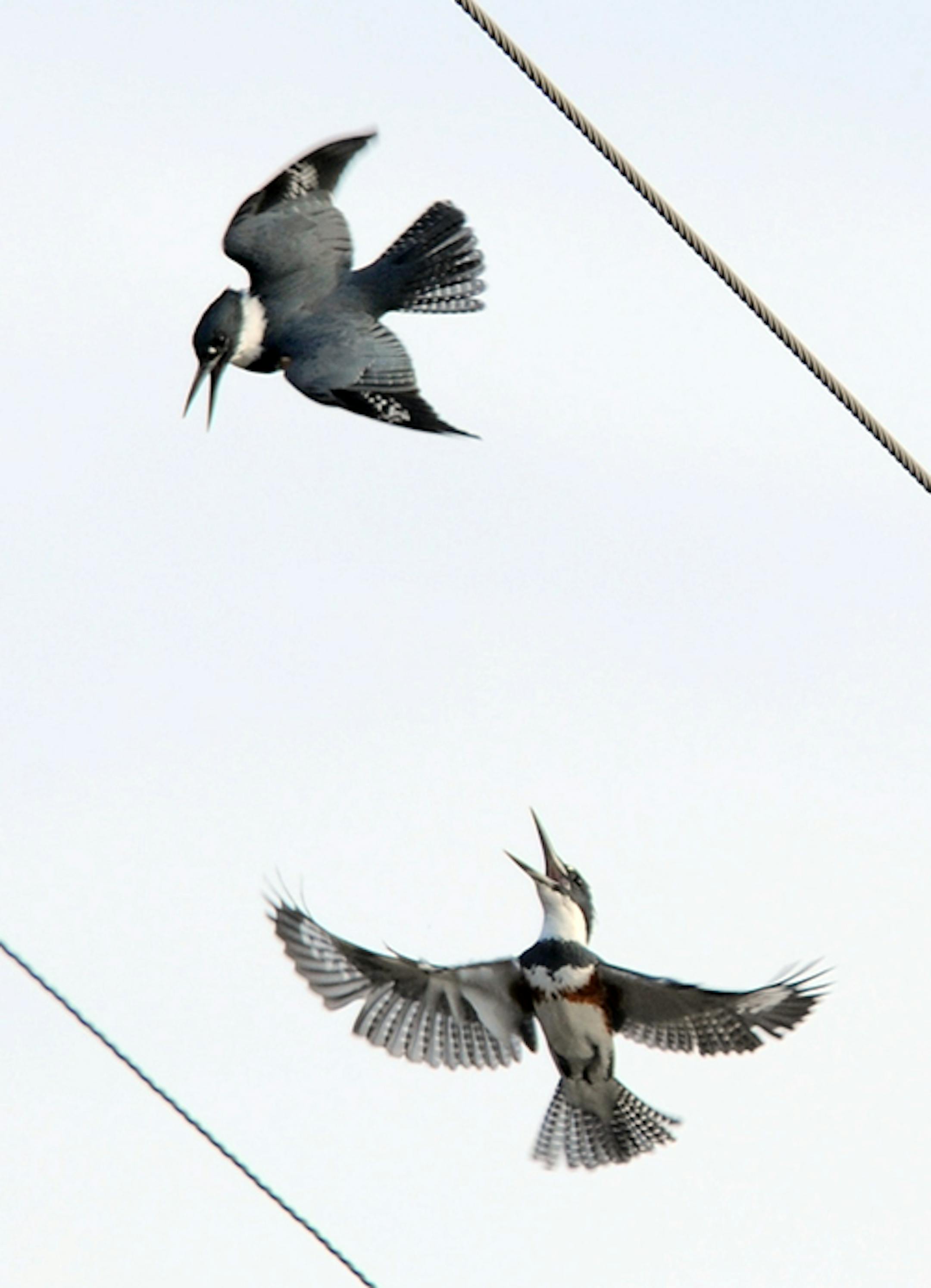 This Belted Kingfisher was changing observation points, moving from willow tree to power liine. It was making this switch about once every 15 minutes late in April. It was being seen on the east end of Long Lake in Orono. This is the second year that location has attracted a kingfisher. Last spring, the male on site picked a fight with another male, probably because this was mating territory.