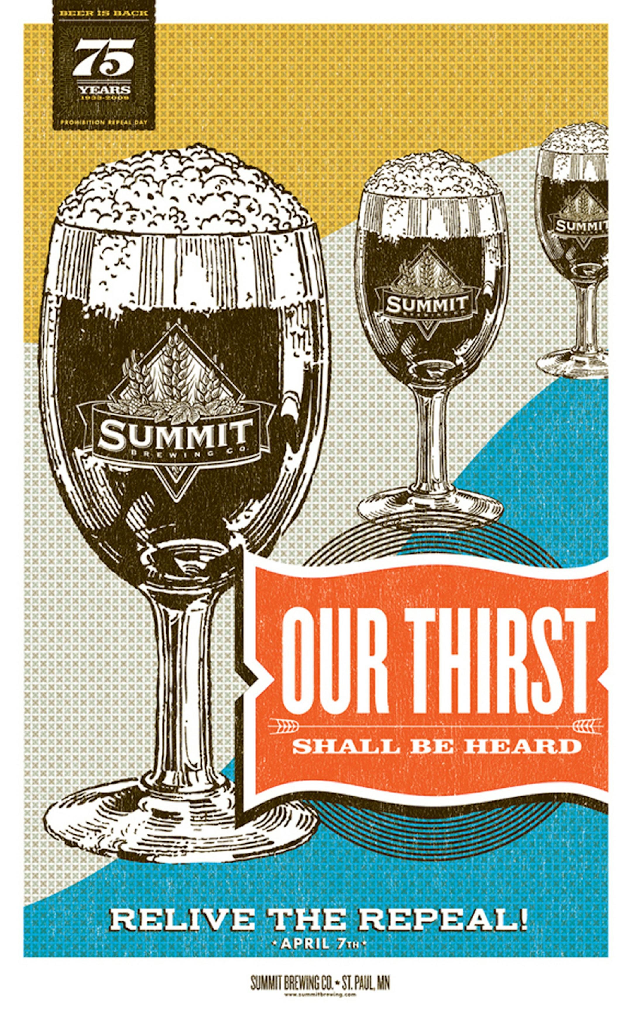 Hear, hear, fellow drinkers, it's time for celebrating. This year marks the 75th anniversary of the repeal of Prohibition. For beer drinkers, April 7, 1933, will always be a special day -- it's when 3.2 beer was legalized, followed by the full repeal on Dec. 5, when the 21st Amendment was ratified. Summit has created a cool commemorative poster with the tagline "Our Thirst Shall Be Heard." It's in bars now, or buy one for $9.95 at the brewery's gift shop (910 Montreal Circle, St. Paul. 651-265-7800. www.summitbrewing.com).
