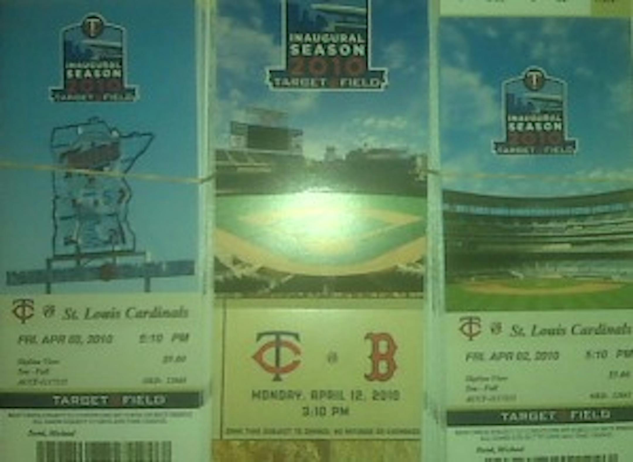 But things brightened considerably when we arrived home and saw that our 2010 Twins season tickets had arrived. There they are, in all their glory. One for every game on the right and left (splitting them up six ways). A moment of panic over the seeming absence of opening day tickets gave way to relief when we realized those big suckers you see in the middle are special commemorative tickets for Game 1.