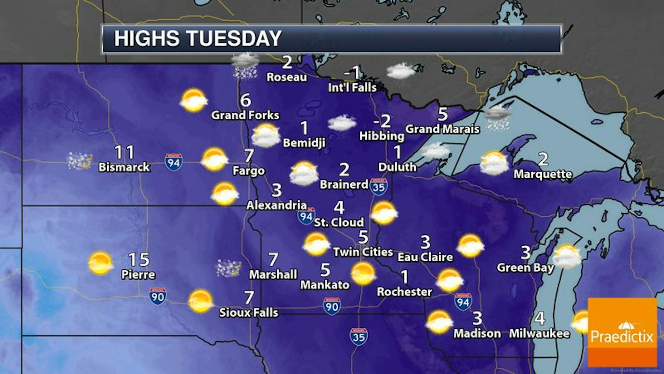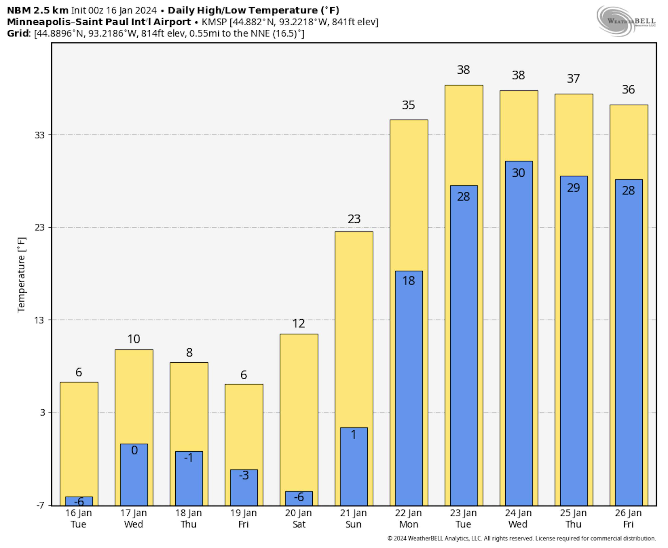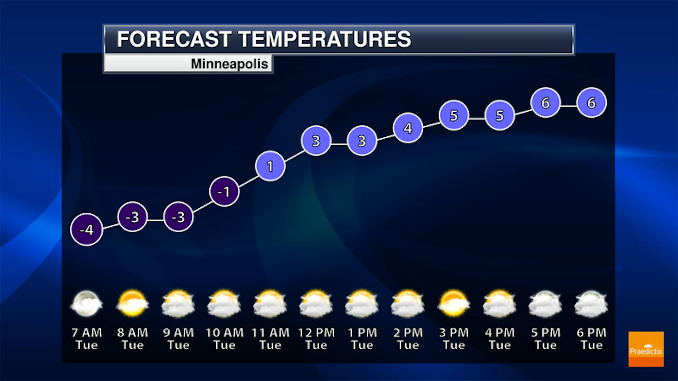Temps in the Twin Cities over the next several days will continue to see very cold temps with readings running well below average for this time of the year. As we approach the weekend and into next week, we'll see a pretty dramatic shift toward warmer temps once again.