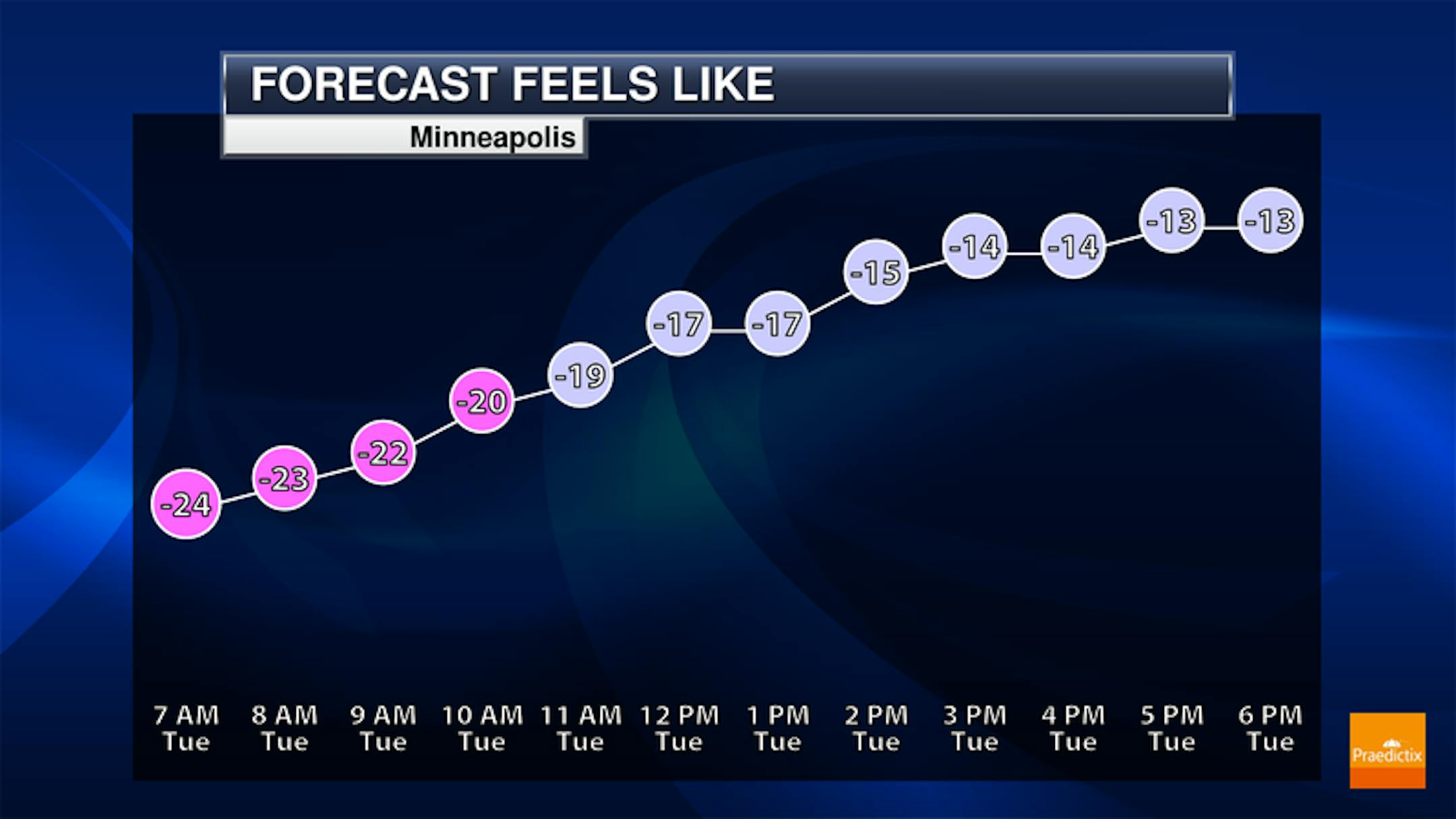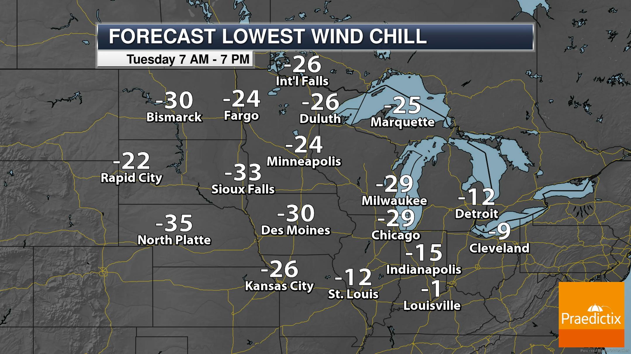 Here's the lowest wind chills expected on Tuesday. Some locations will be in the -20s to -30s across the region, which means that frost bite could occur within minutes for some. Bundle up!