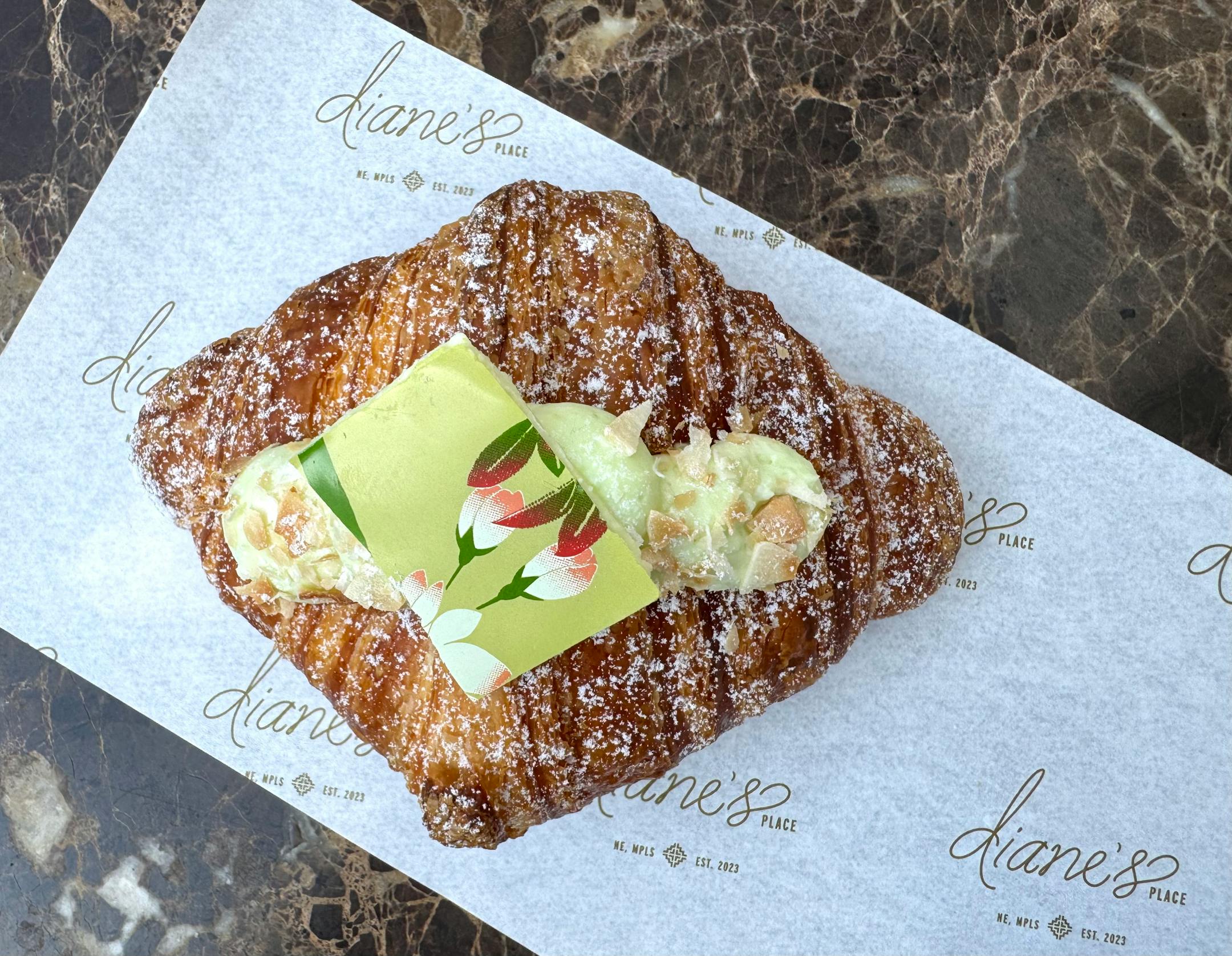 The northeast Minneapolis eatery keeps growing its list of local and national accolades and remains one of the hottest reservations in town. So it’s nice that in addition to dine-in, there’s also a coffee counter to grab lattes and chef Diane Moua’s award-winning pastries to go. The pandan croissant is one of those pieces of art. A best-in-class croissant, airy in the middle, shatter-apart on the outside, is infused with a pandan whip before getting topped with toasted coconut and a slim white chocolate square decorated with a tulip garden scape. It’s almost too pretty to eat, yet so game-changing that it would be a shame not to.