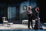 Benjamin Olsen has crafted a white-splashed scenography that’s gorgeous and swanky. And it features a sofa that’s used repeatedly for a schtick that never gets old. Similarly, Mathew LeFebvre’s costumes are the height of elegance.