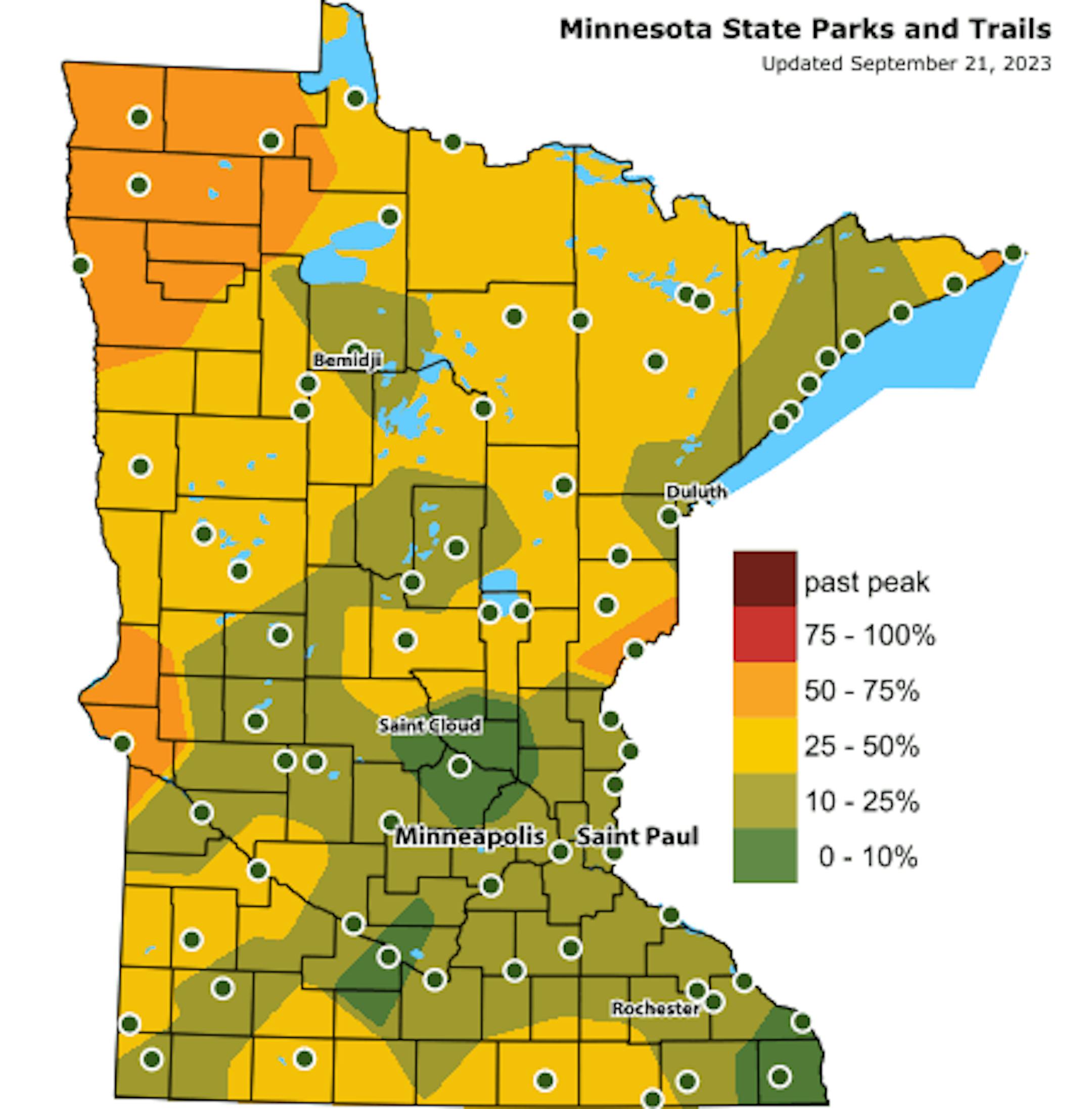 According to the MN DNR, the fall color season is underway and happening fast. Parts of western and northwestern Minnesota are halfway through the season with peak not far behind. Fall colors will continue to rapidly change, so take a moment and enjoy the season while you can. Note that most leaves will vacate the premises in about 1 month and won't return until sometime in mid/late May...