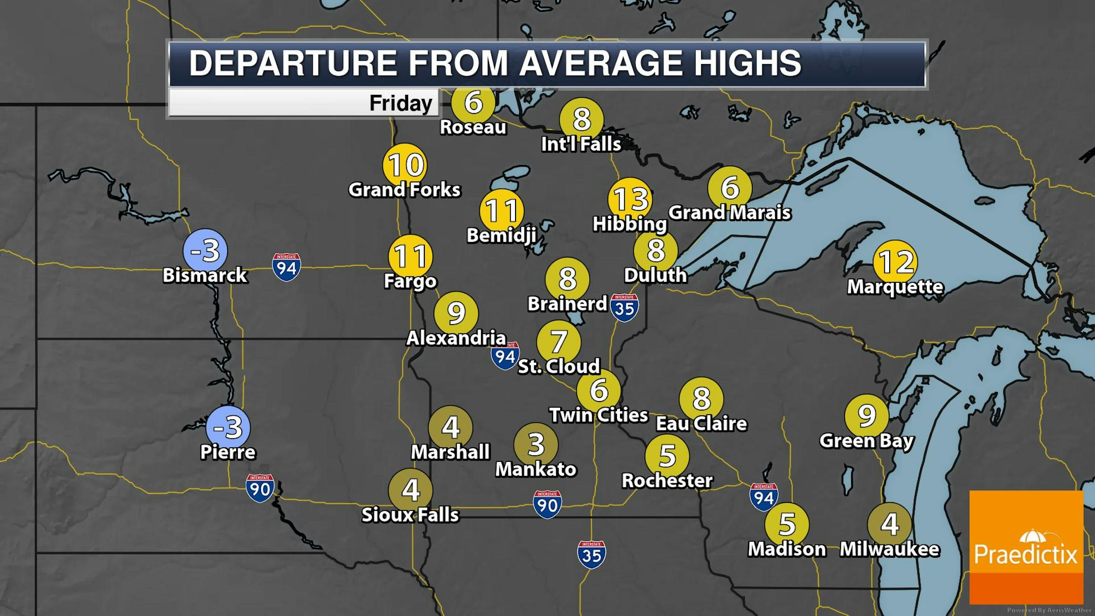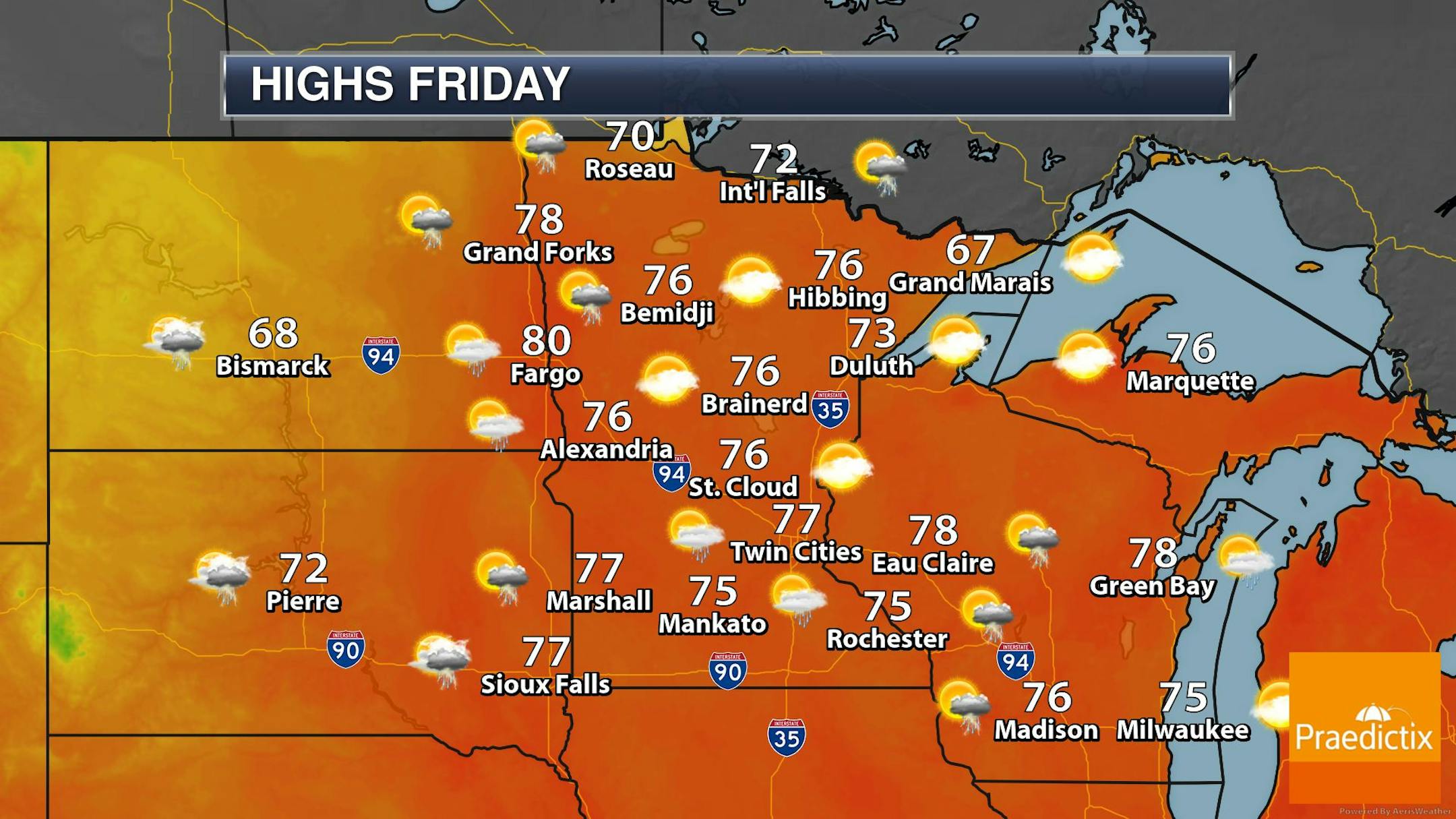 Here's the simulated radar from AM Friday to Saturday night. The center of circulation will be situated over the Dakotas and will be the feature responsible for the widespread showers and storms across much of the region. Multiple waves of rain will be possible over the next few days and some spots could see 1" to 2" of rain or more through Sunday. Note that some of the storms could be strong to severe as well.
