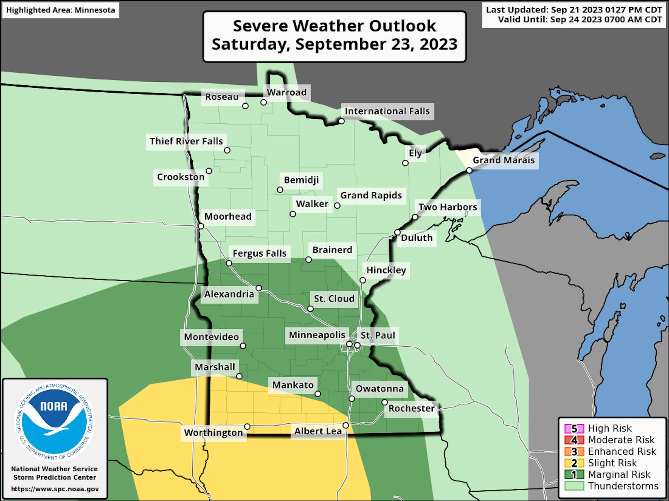 According to NOAA's Storm Prediction Center, there is a Marginal Risk of severe thunderstorms across the southwestern part of Minnesota. The main concern will be hail along with pockets of heavy rain.