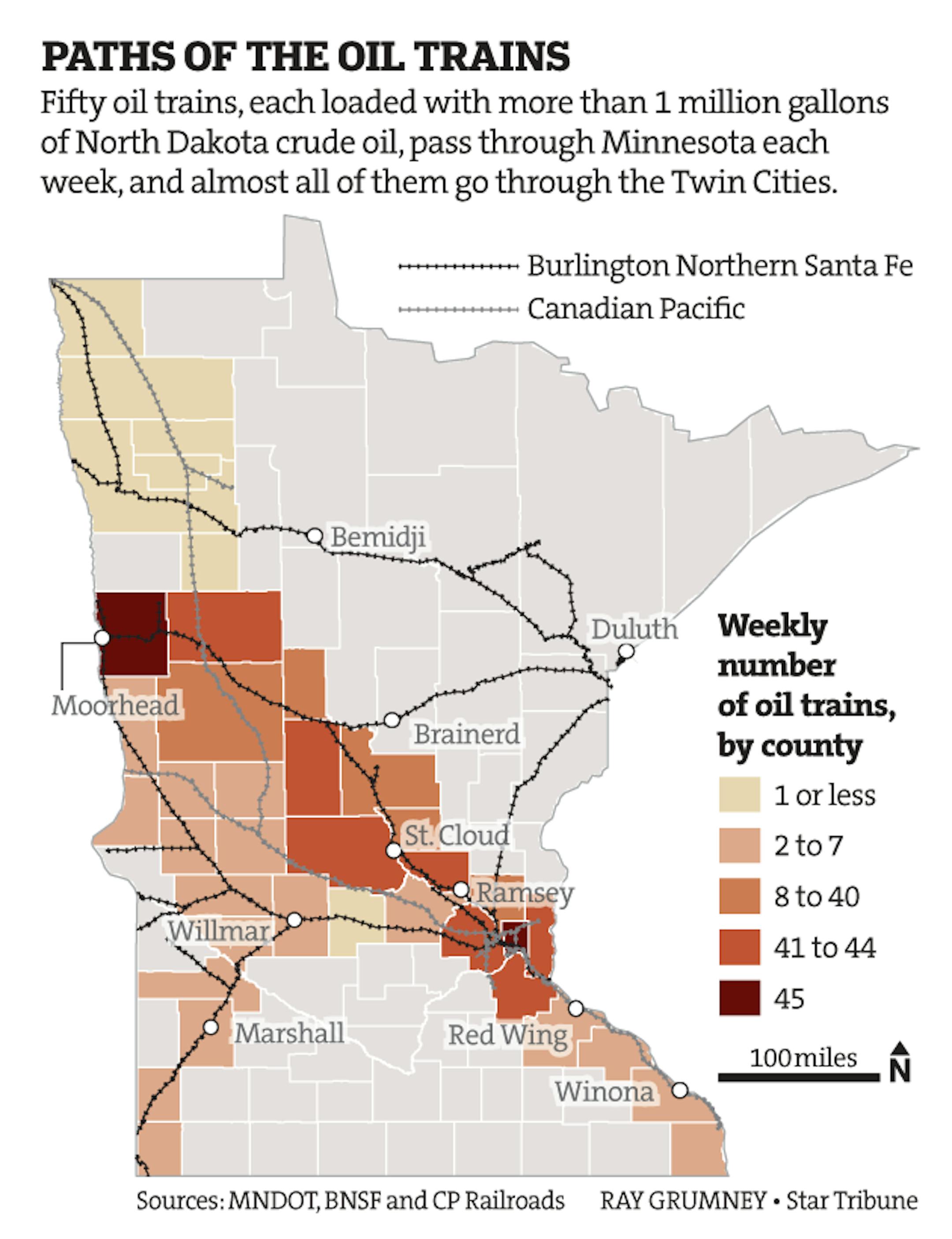 Fifty oil trains, each loaded with more than 1 million gallons of North Dakota crude oil, pass through Minnesota each week, and almost all of them go through the Twin Cities.