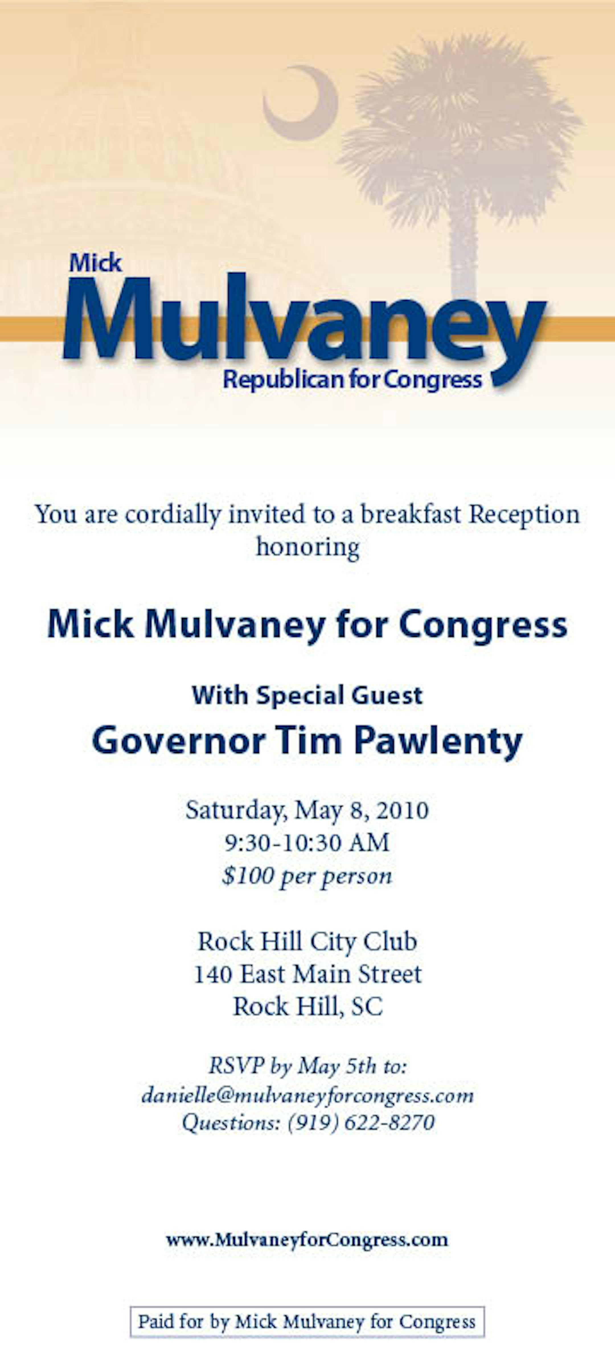 Minnesota Gov. Tim Pawlenty is slated to make his first political foray into South Carolina in May, according to an invitation to an event for Republican congressional candidate Mick Mulvaney.