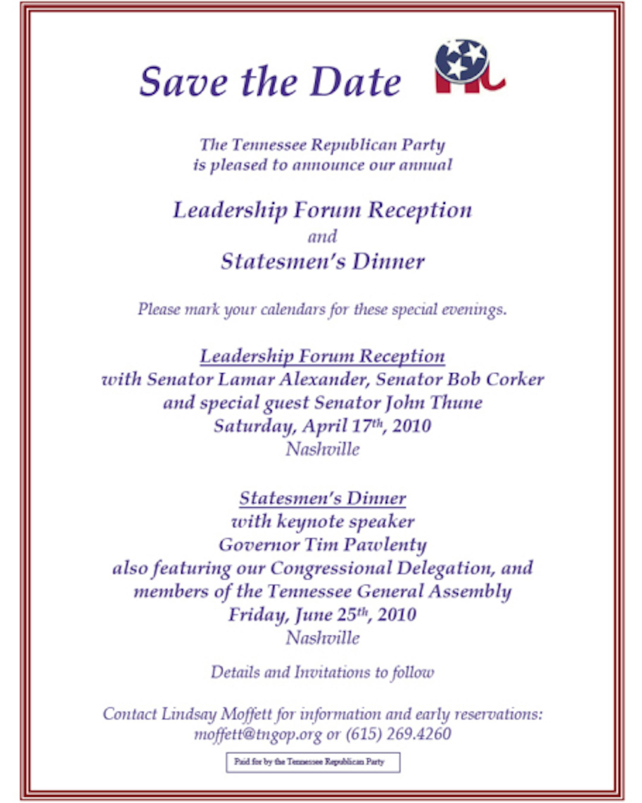 The Tennessee Republican Party Tuesday sent out a "Save the Date" invite for a June 25 dinner featuring keynote speaker Gov. Tim Pawlenty, according to an invite obtained by the blog4president.org.