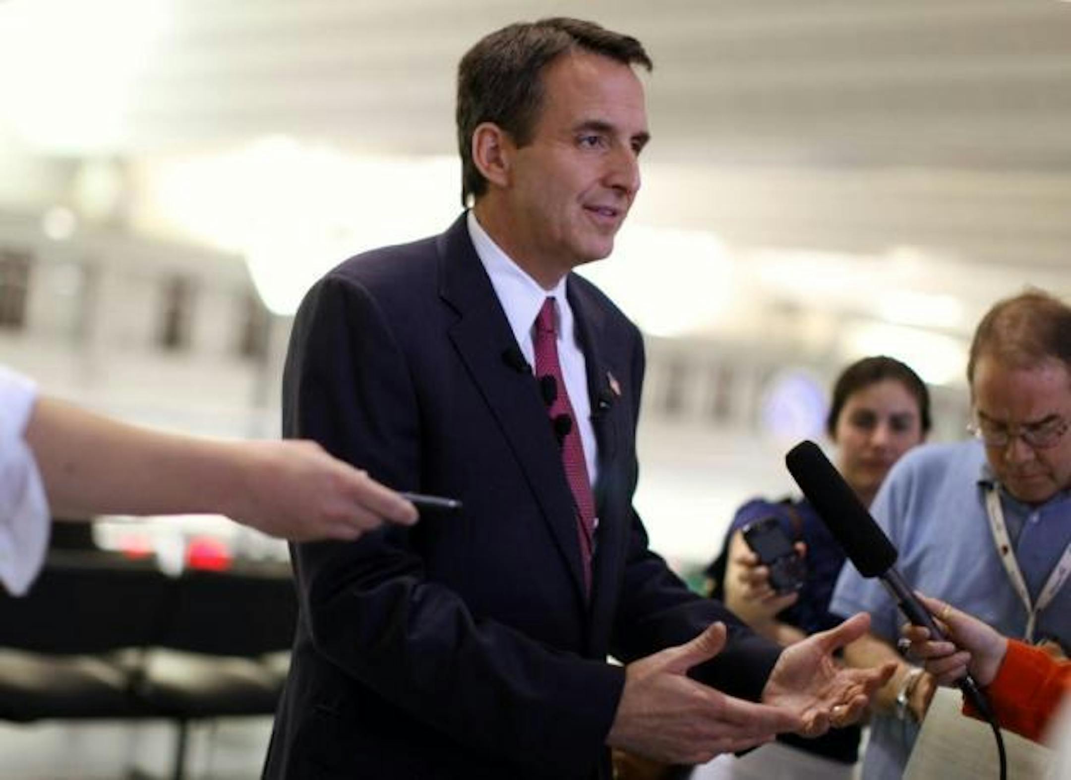 Former Minnesota Gov. Tim Pawlenty, now running for president, said that both the shutdown he oversaw in 2005 and the one now happening were the fault of Democrats during a stop at the Minneapolis-St. Paul airport Thursday night.