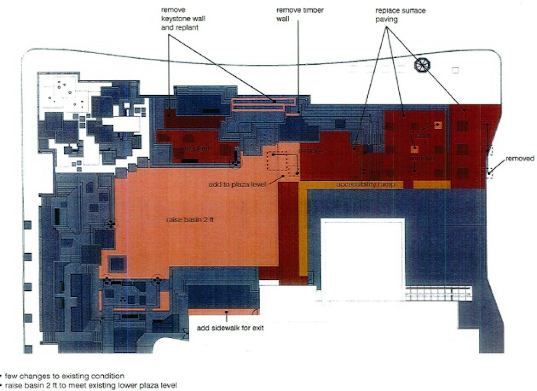 Among the possible improvements is a new water feature that could be drained and transformed into a walkable area for events.