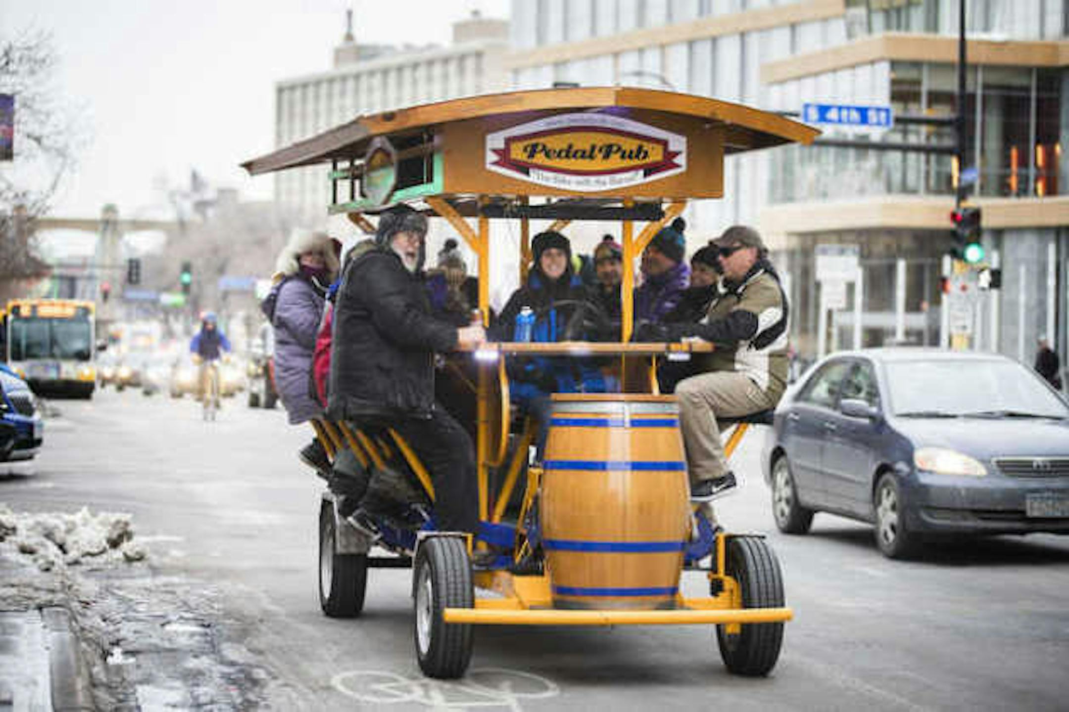 Above: The PedalPub rolls down Hennepin Avenue on Tuesday, opening in the winter for the first time in a decade for special Super Bowl week tours.