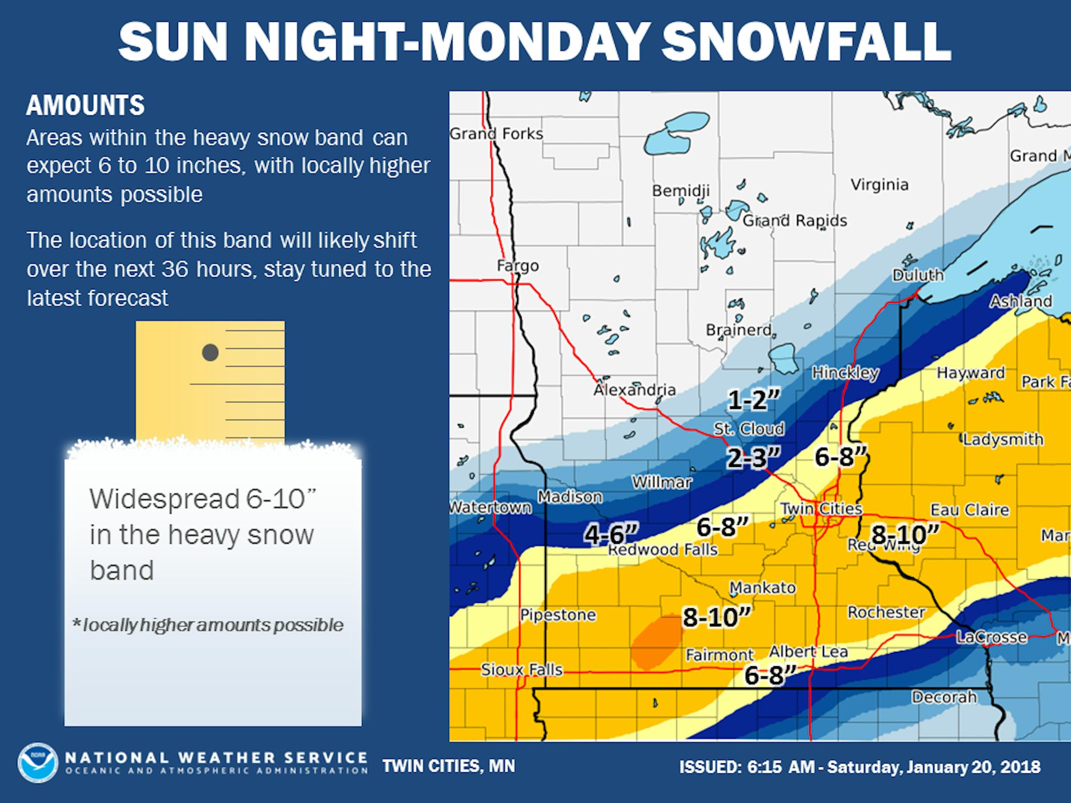 For now, the heaviest snow is forecast to fall along a line from Mankato to St. Paul to Ladysmith, Wis., where up to 8 inches could fall. Freezing rain could mix in on the southern edge of the storm in places such as Rochester and Winona. Some ice could form as temperatures drop from the 30s into the 20s, the weather service said.