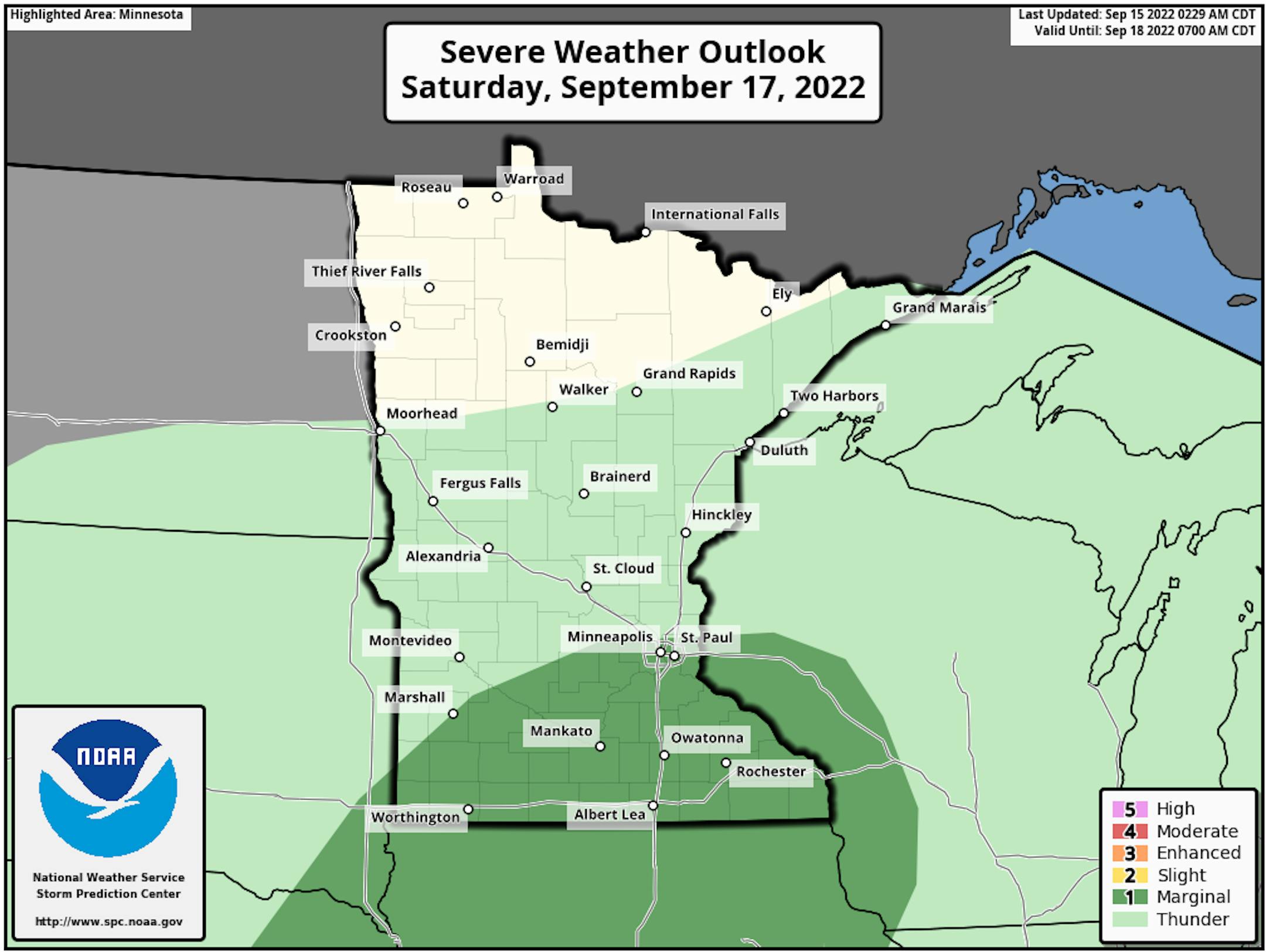 A few of the storms that pop later Saturday into Saturday Night could be on the strong side across southern Minnesota from the metro southward. A Marginal Risk of severe weather (threat level 1 of 5) is in place.