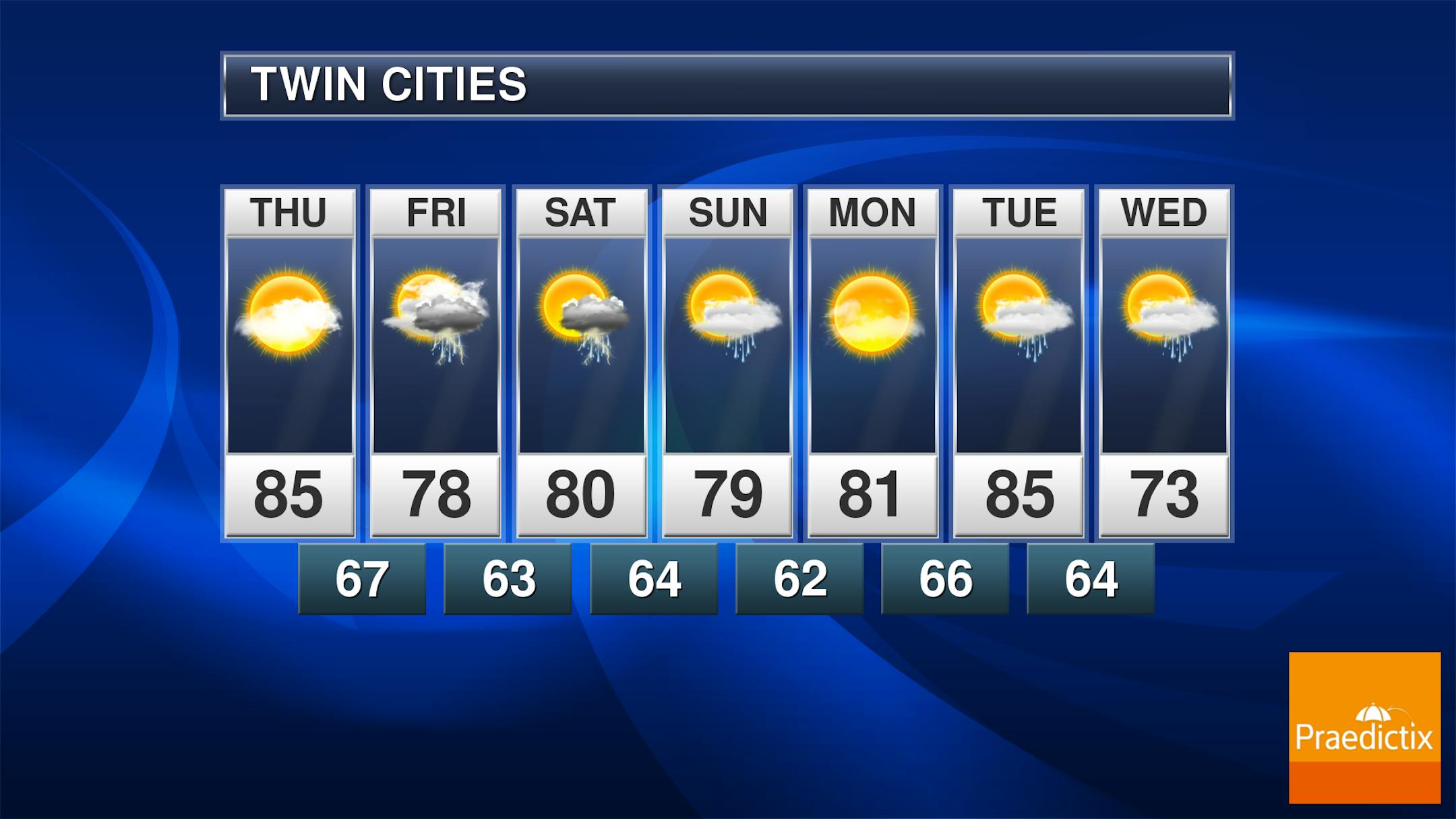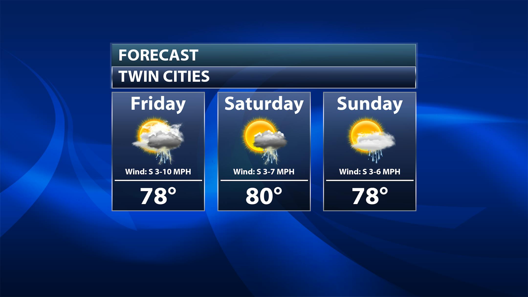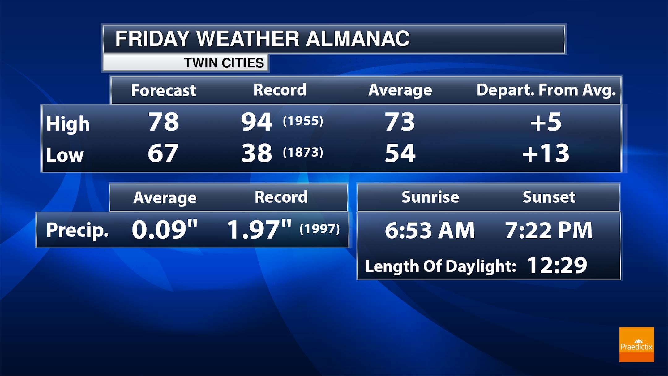 As we head into Friday, we will be watching shower and thunderstorm potential across the Twin Cities. The greatest potential will be in the early morning hours, with redevelopment possible in the afternoon and evening. Otherwise, partly sunny skies are expected. Temperatures will start off in the mid-60s, only climbing to the mid-70s for highs.