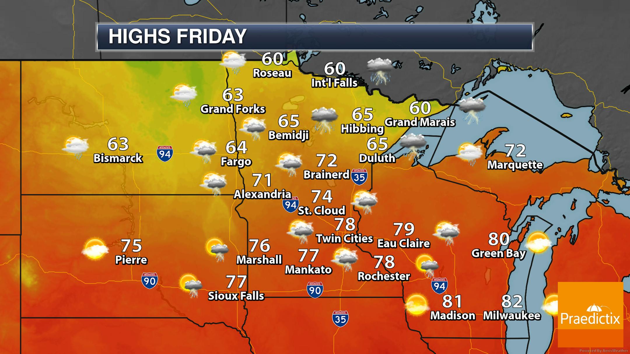We will watch the potential of showers and storms across the state on Friday, with the greatest odds of seeing more constant rain up across parts of northern Minnesota (particularly the Arrowhead region). Highs will range from near 60F up in northern Minnesota to near 80F in the south.