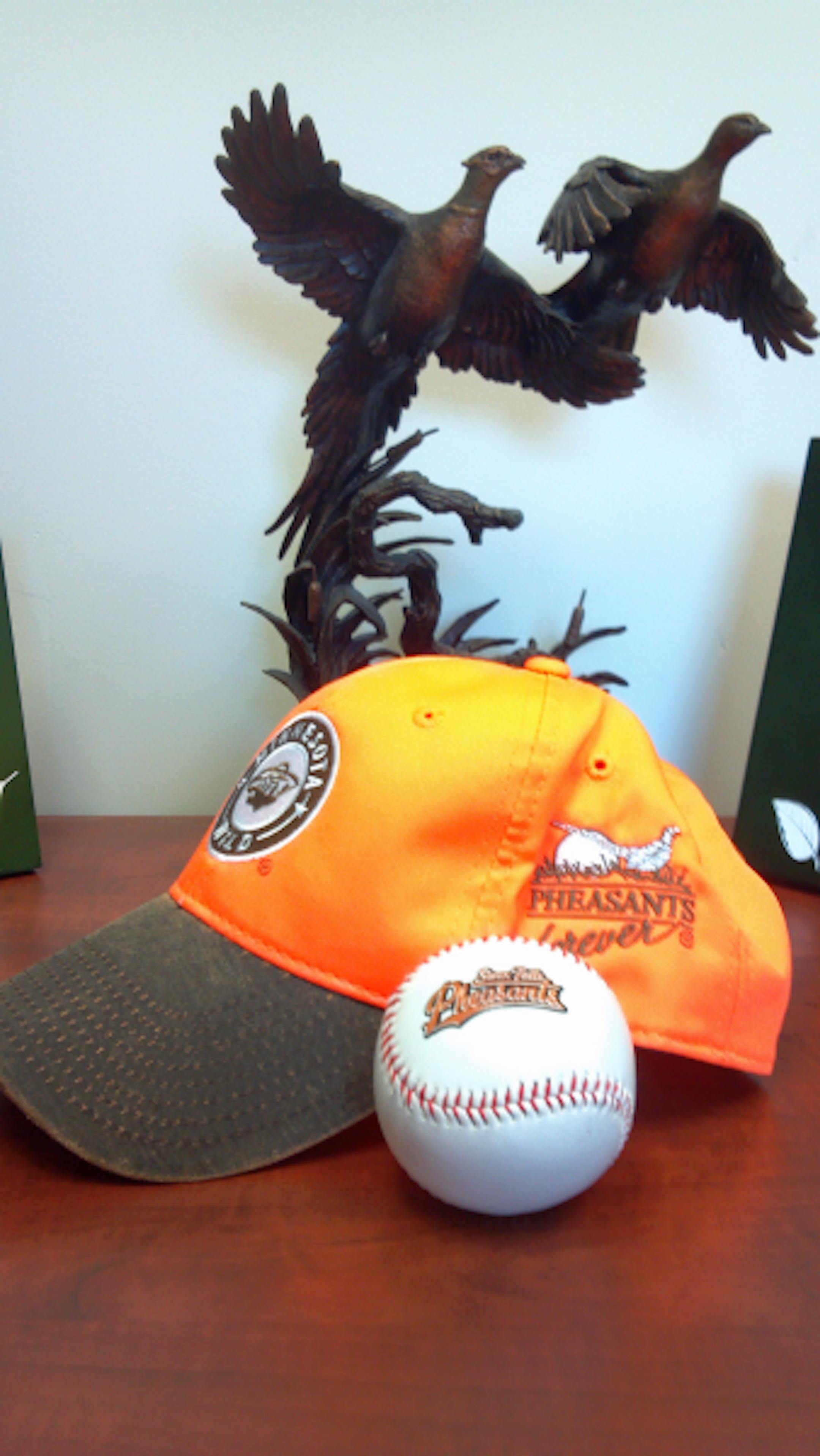 I'd like to see how many images we can gather of pheasants being used to "pitch" products. From all the photos emailed, I'll select the single most interesting pheasant-oriented submission to win the blaze orange Minnesota Wild hat featuring the Pheasants Forever logo along with the Sioux Falls Pheasants logo baseball pictured below.