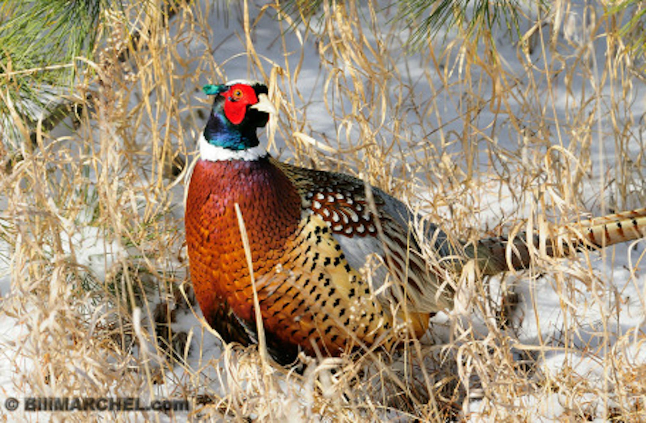 Deep snow and fridgid cold has ring-necked pheasants seeking shelter where they can, in this case in a shelterbelt of red pines.
