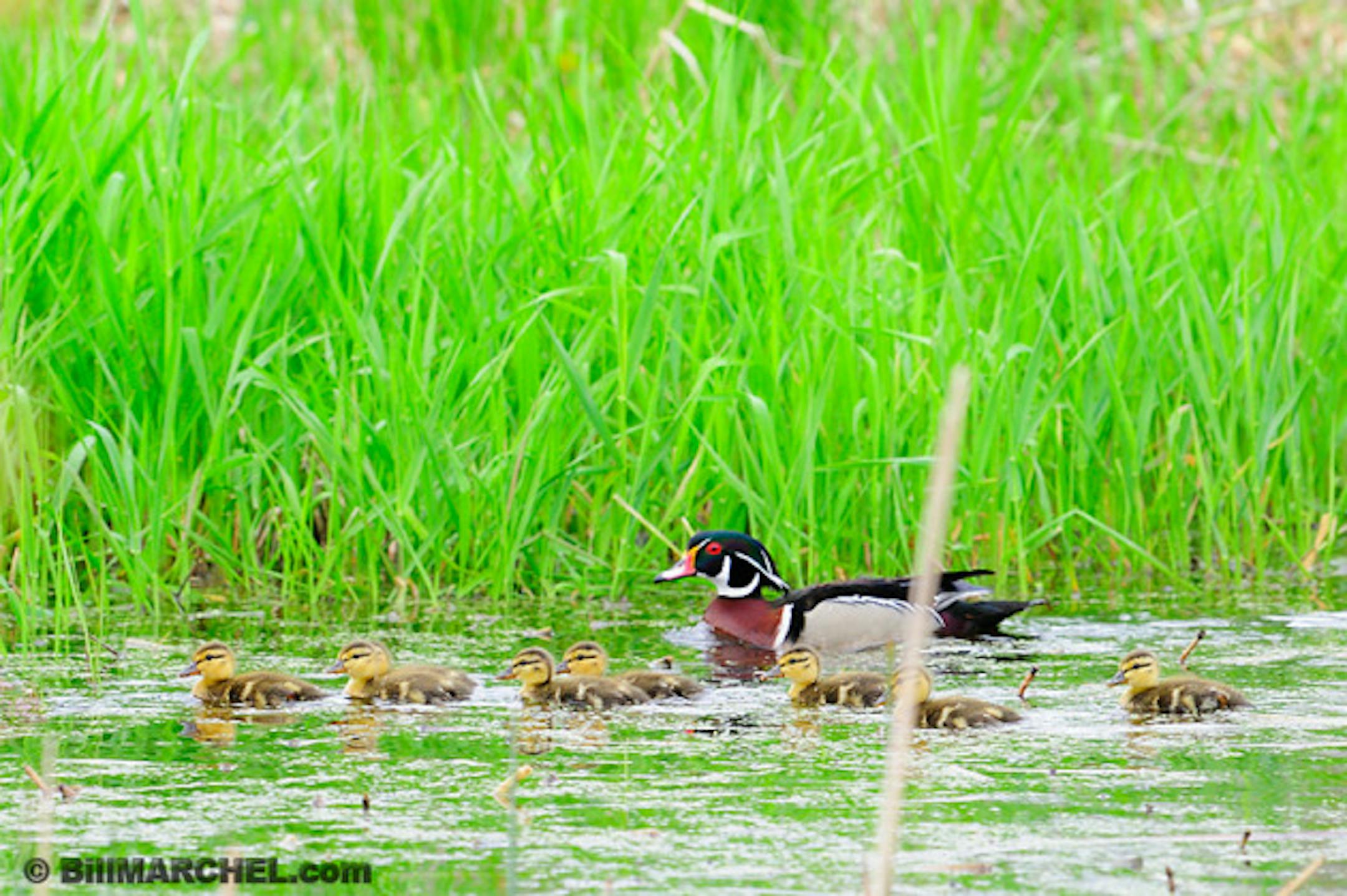 No, this is not as it appears. The ducklings are actually mallards, and the mallard hen is barely out of the photo. The drake wood duck just happened to have been swimming past.