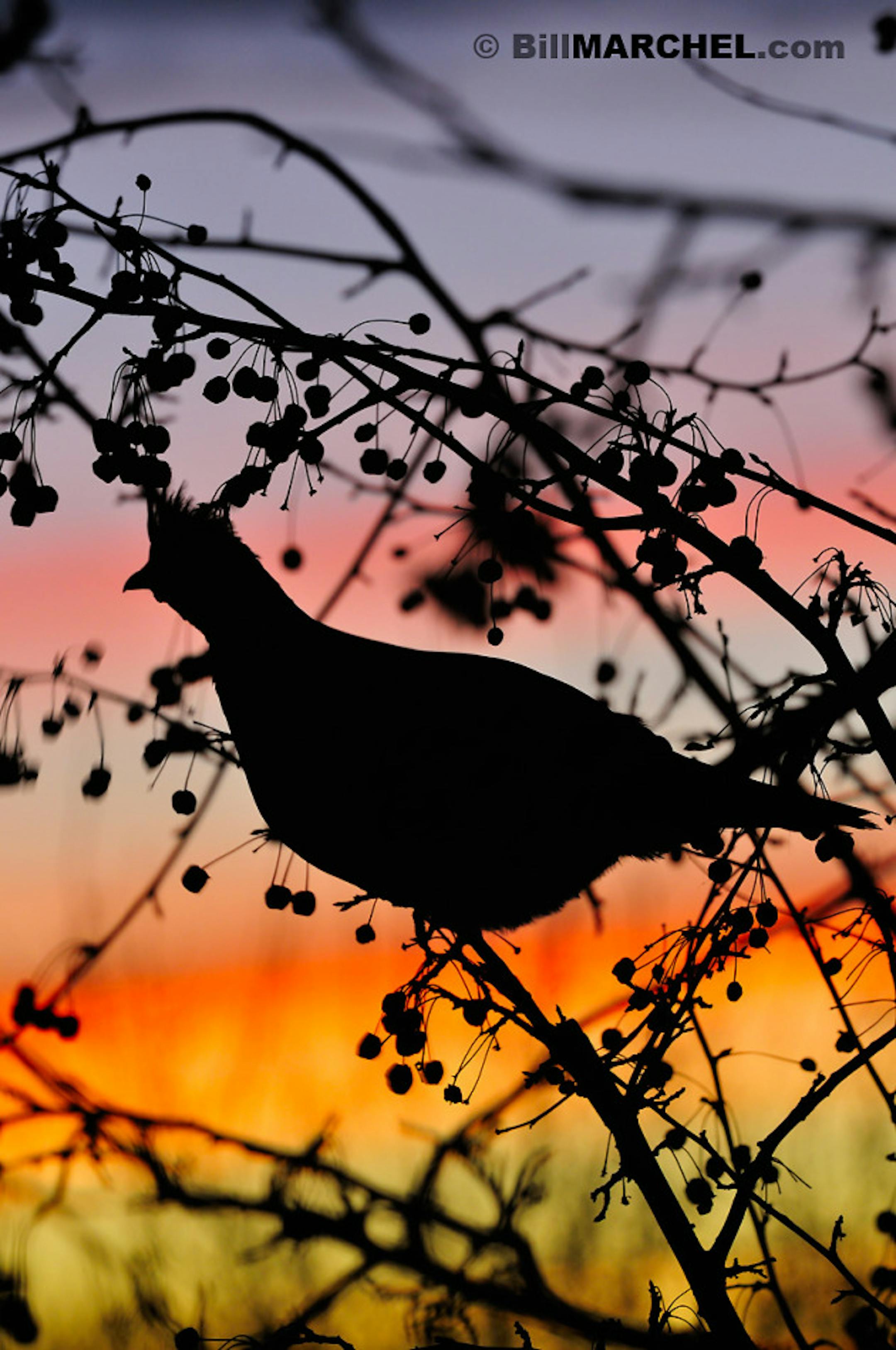 I photographed this ruffed grouse as it fed on crab apples in the afterglow of a winter sunset.